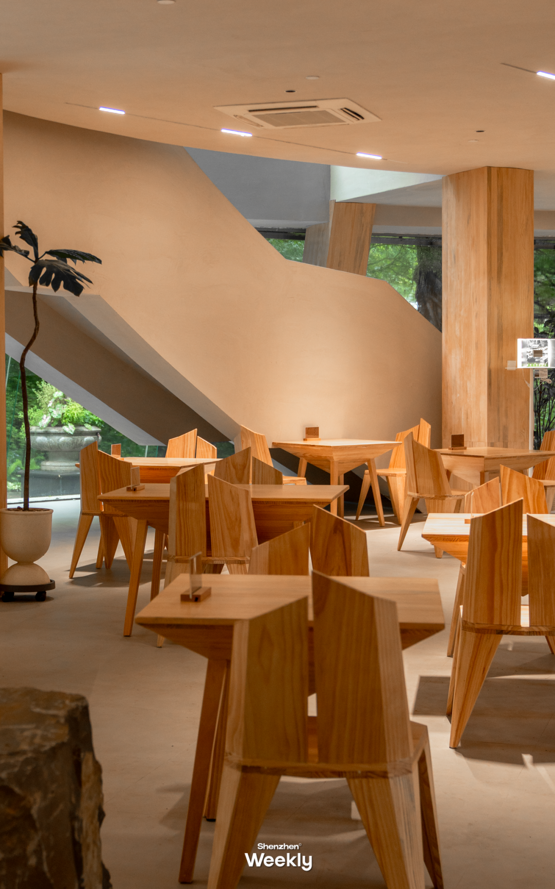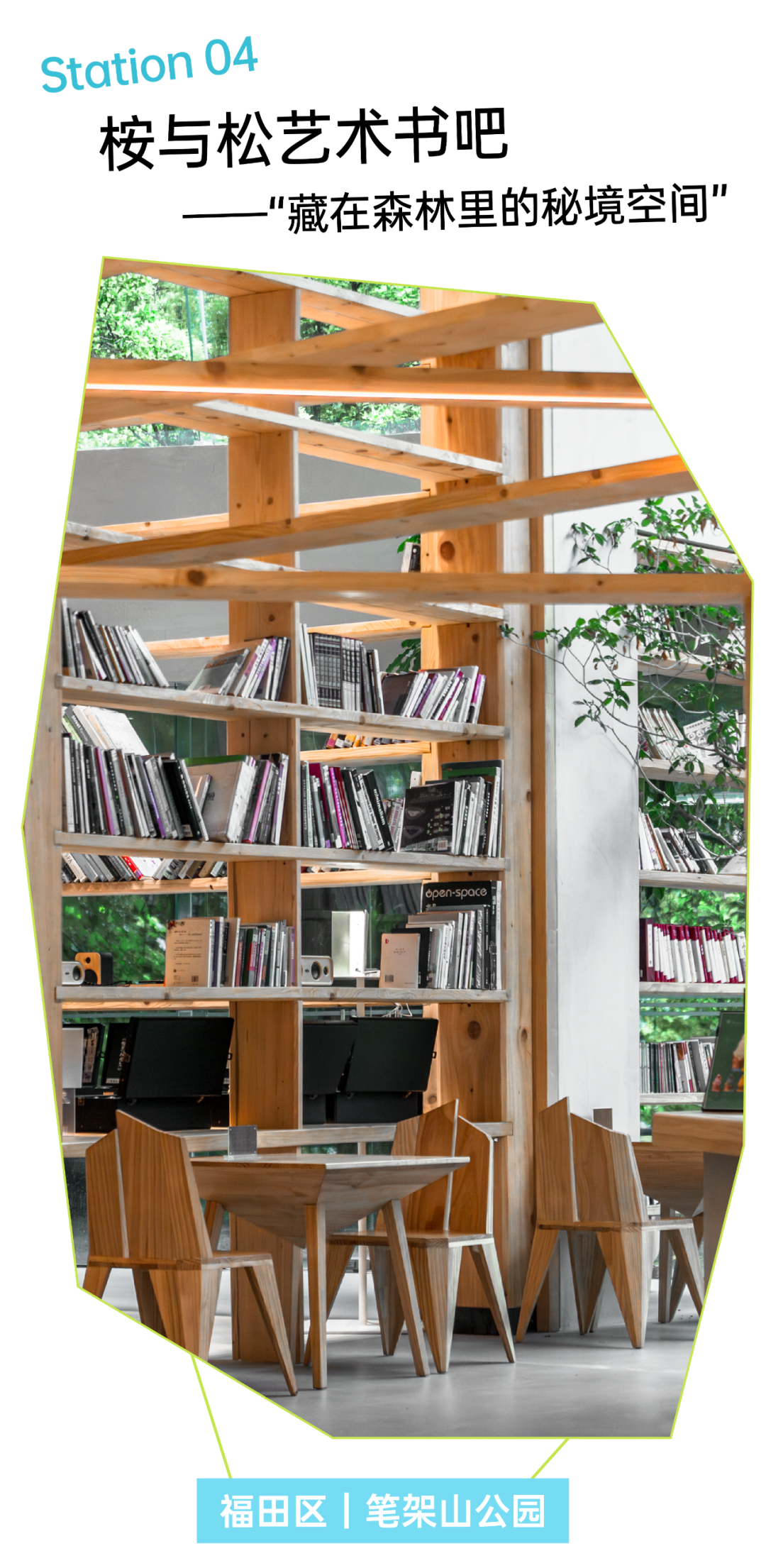 藏于公园绿意深处的精神充电站——桉与松艺术书吧,一个集多元文化的体验空间,以自然与艺术交融的美学书吧。书吧整体是一栋临湖而建的玻璃房,周围被绿意盎然包裹,尽是自然之趣。室内是干净简约的侘寂风style,高大的木书架穿梭其间,满满的自然气息;一共两层,一楼是书吧,二楼则是茶艺空间。这里会不定时开展、艺术文化沙龙,大家在阅读或自习时,都能得到充分的放松。地址:福田区笔架山公园展览馆