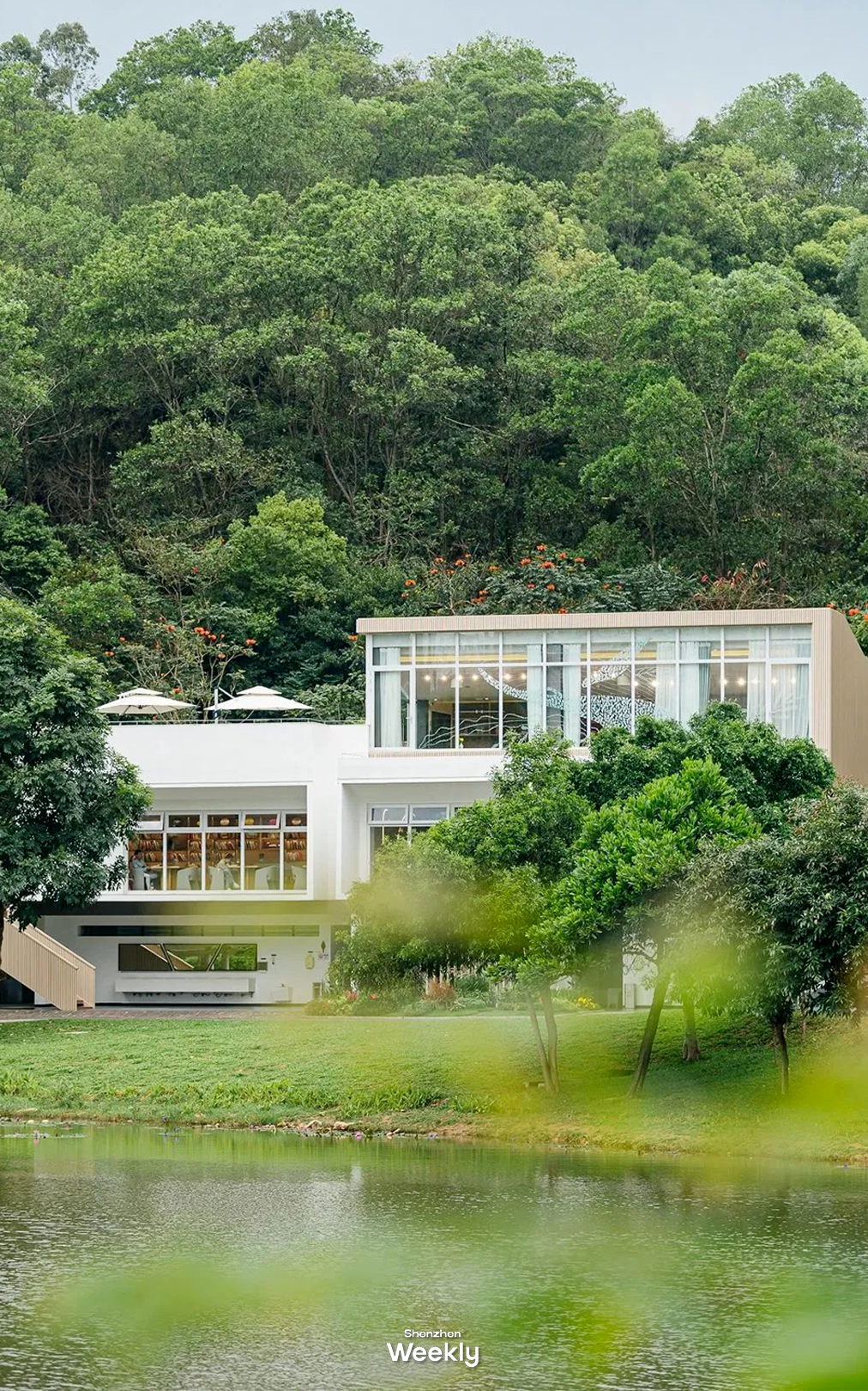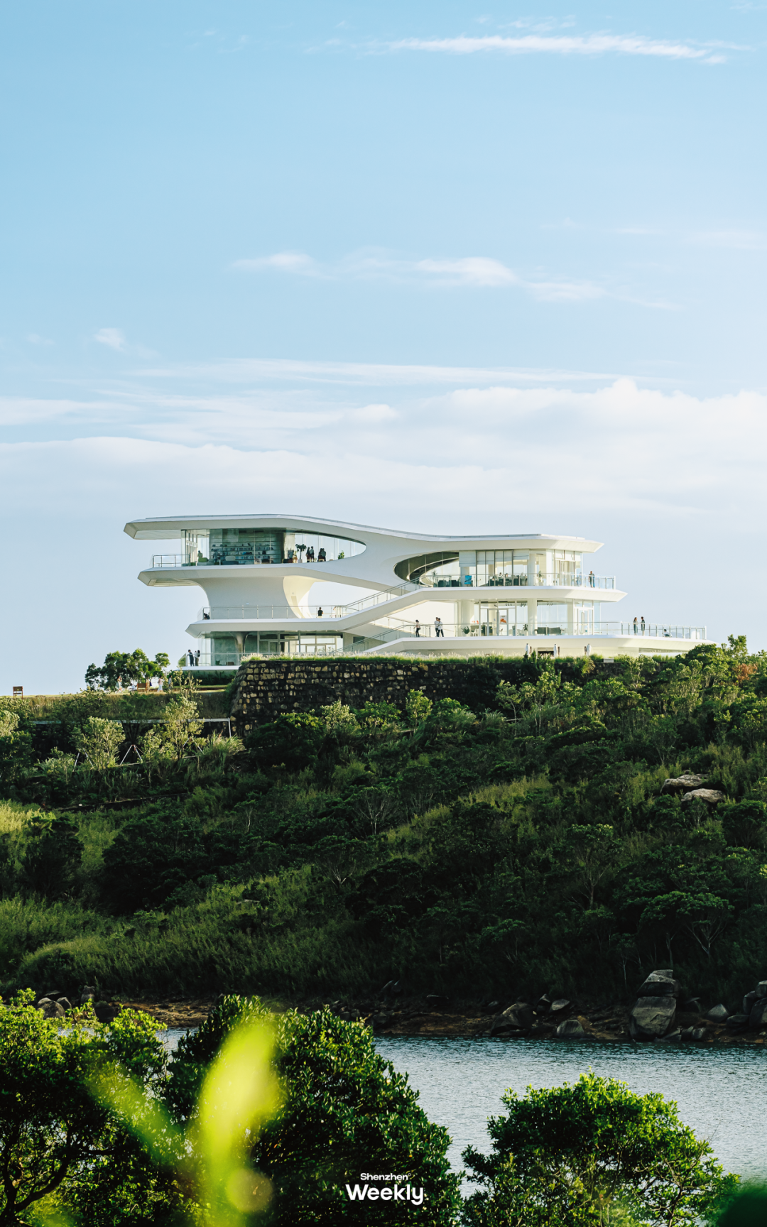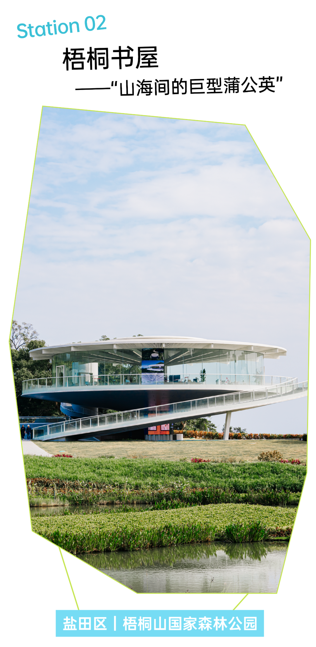 另一座山海地标——梧桐书屋,位于梧桐山国家森林公园内的梧桐亭,背靠梧桐山,与恩上湿地公园相邻,身处观景台便可将盐田山海之景尽收眼底。梧桐书屋设于梧桐亭二层,一整个环绕式建筑,洁白墙面,全透明的玻璃墙,跟整个山谷的绿色融为一体。坐在靠近窗边的位置,可以看蓝天白云,也能将山林的绿意收藏。很适合作为徒步经过的歇脚点,在这里休息、阅读、发呆都是不错的选择。地址:盐田区海山街道恩上湿地公园