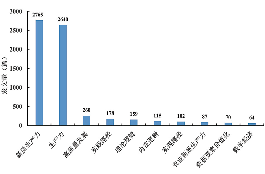 按照新质生产力研究排行前十的主题绘制出关键主题统计图(见图2),新质生产力研究主要涉及新质生产力、生产力、高质量发展、实践路径、理论逻辑、内在逻辑、实现路径、农业新质生产力、数据要素价值化、数字经济等主题。