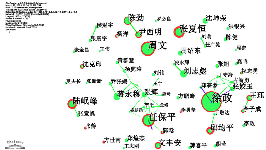 通过Citespace软件制作出作者及合作网络图谱(见图4)。其中,每个节点代表一个作者,节点之间的连线表示作者之间的合作关系,节点的大小和连线数量可以反映作者的发文量和合作频率。根据连线梳理,该研究领域中的合作群由徐政、张辉、张斌、任保平等人组成。根据图4可知,有关新质生产力研究的发文作者数量为517位,网络密度为0.0022,整个图谱比较分散,关联中心性较低,说明该研究领域的学者在开展研究时大多为独立研究,合作关系并不密切。因此,学者之间的合作研究有待进一步加强,从而打破学科壁垒。
