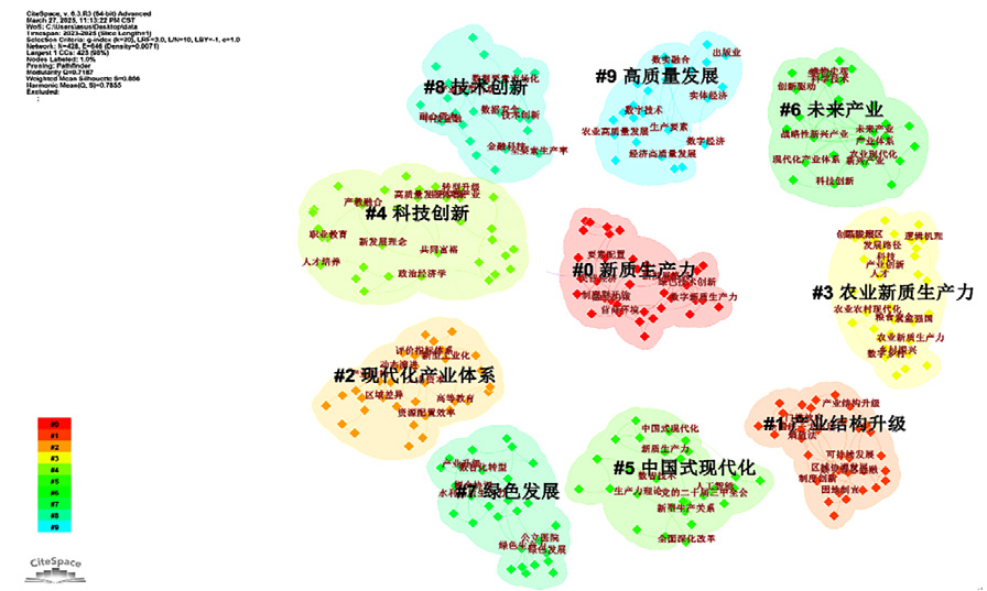 通过Citespace软件制作出关键词聚类图谱(见图7),其中每个节点代表一个关键词,节点之间的连线表示关键词之间的关联程度。图7显示,共有10个聚类群集,其中“新质生产力”为最大的聚类团,包含36个关键词,其次分别是“产业结构升级”“现代化产业体系”“农业新质生产力”“科技创新”“中国式现代化”“未来产业”“绿色发展”“技术创新”“高质量发展”。
