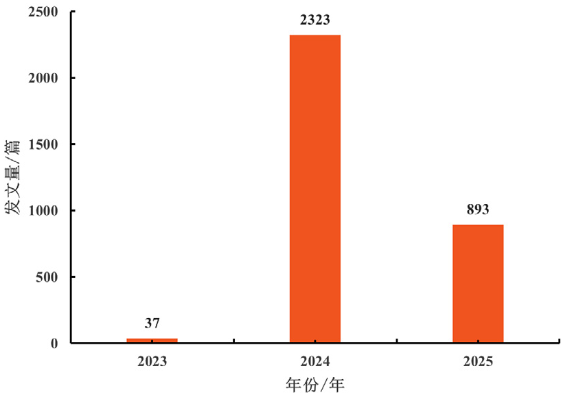 按照新质生产力研究的论文年度发文量绘制出年度发文量统计图(见图3),2023—2025年(截至2025年3月27日)学者们共发表文献3253篇,发文量呈现出逐年上升趋势。