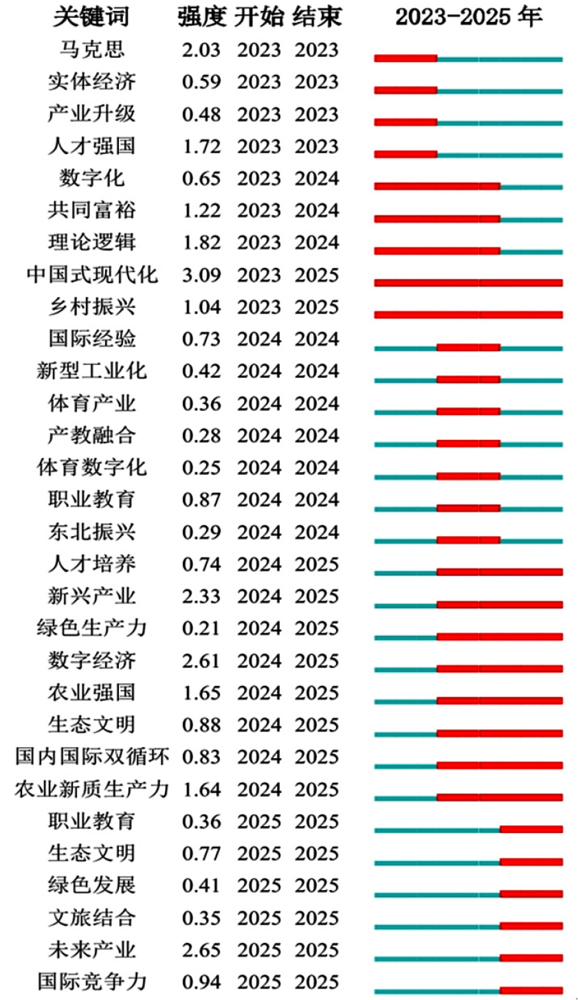 通过对关键词突现图谱进行分析,发现自新质生产力提出以来,初期出现了“中国式现代化”“共同富裕”“乡村振兴”等主要与宏观研究相关的关键词,后续出现了“东北振兴”“人才培养”“体育数字化”“职业教育”等关键词。这些地方性、区域性、领域性的高频关键词的出现,为深入理解新质生产力的研究视角的变化提供了重要参考。