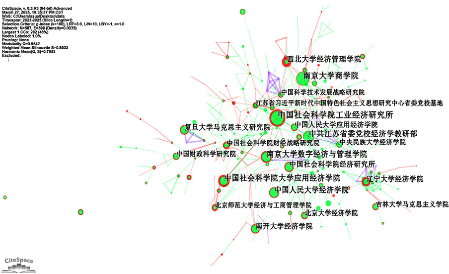 运用Citespace软件制作出机构及合作网络图谱(见图5)。由图5可知,3253篇文献主要来自587家机构,其中形成了以南京大学商学院、中国社会科学院工业经济研究所、中国科学技术发展战略研究院等为中心的核心研究群。该图谱的网络密度为0.0035,整个图谱比较分散,意味着很多机构没有建立起良好的合作关系,在新质生产力研究领域还有着较大的合作空间。