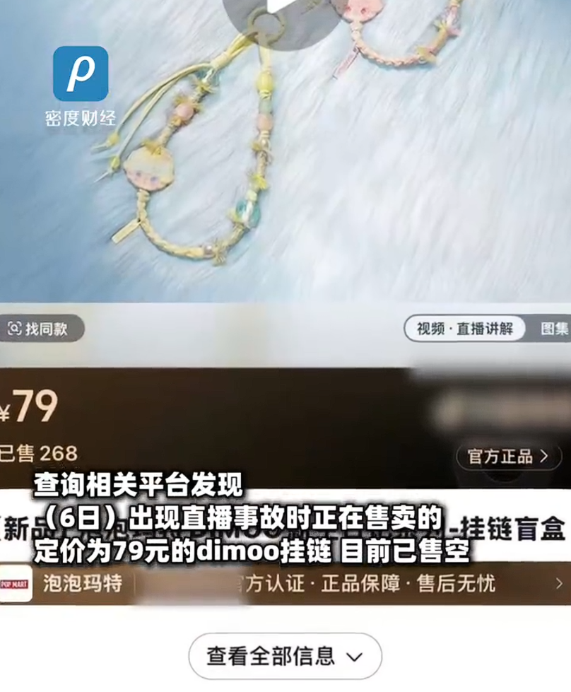 据中山网密度财经查询相关平台发现,前一晚(6日)出现直播事故时正在售卖的定价为79元的dimoo挂链,目前已售空。值得注意的是,在某购物平台上,该系列的隐藏款已被炒至近500元,溢价超6倍。