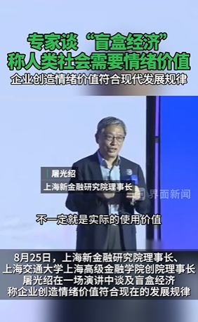 8月25日,上海新金融研究院理事长、上海交通大学上海高级金融学院创院理事长屠光绍在一场演讲中谈及盲盒经济,称企业创造情绪价值符合现在的发展规律。 屠光绍说:“拆个盲盒做一个产品,更多的不一定是实际使用价值,更多的是一种情绪价值。情绪价值也是我们人类社会所需要的,特别年轻人越来越(需要)。”