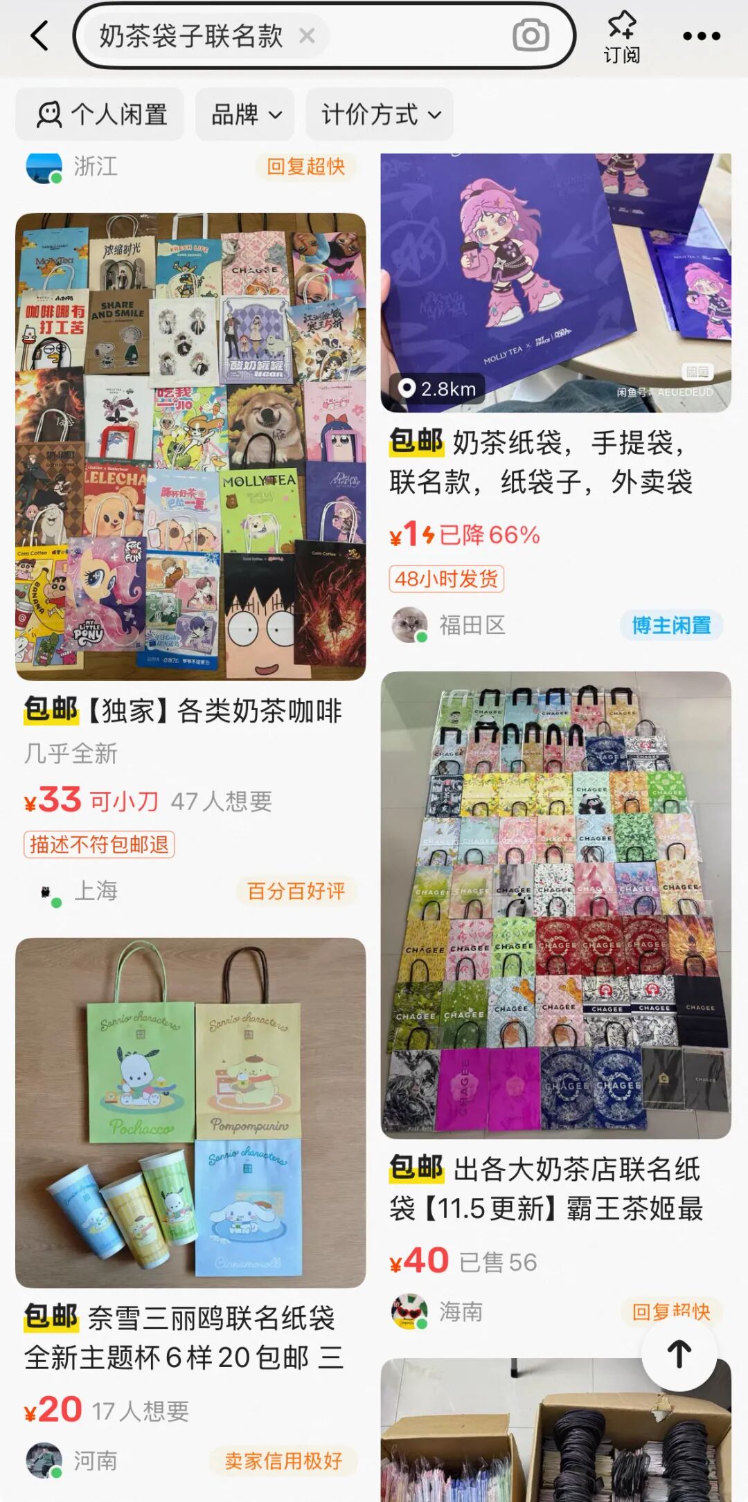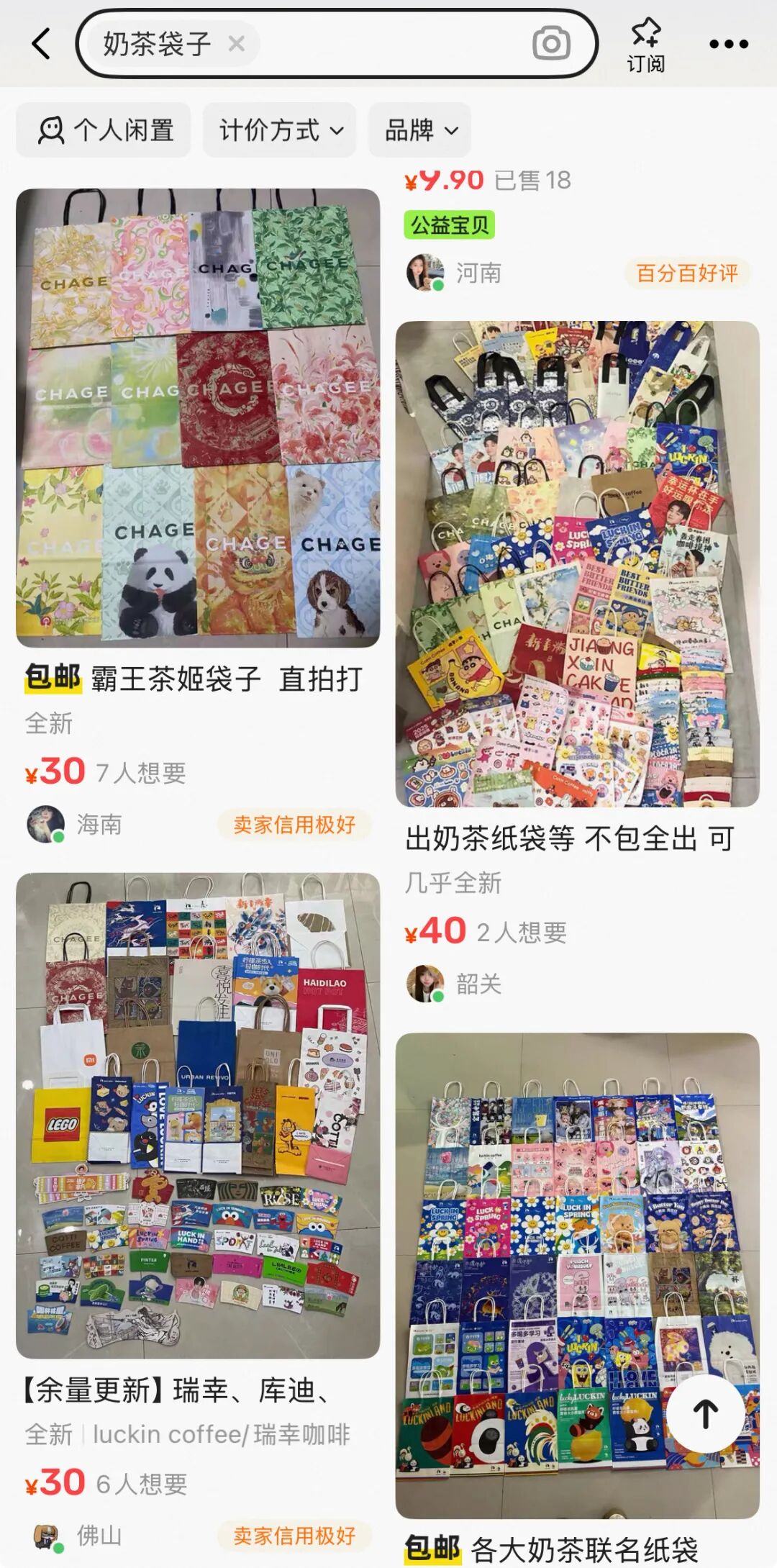 前段时间 #一代人有一代人的破烂# 冲上热搜 大家纷纷晒出自己收藏的奶茶袋子 霸王茶姬、一点点、瑞幸…… 各种牌子 各种样式,应有尽有 而最近,二手平台上的 “奶茶包装袋”火了 有人靠它赚了近千元 让网友直呼“后悔用来装垃圾了”