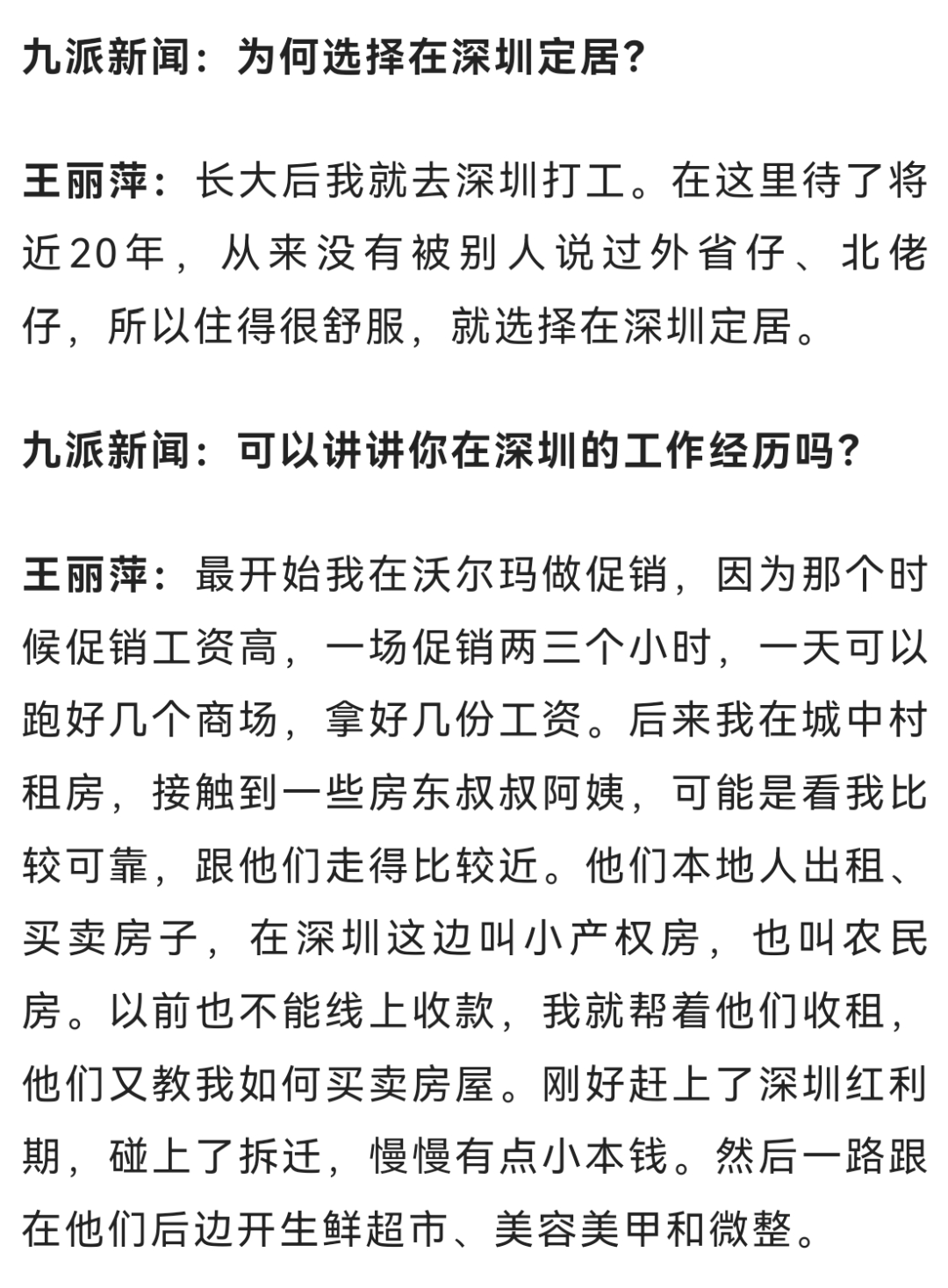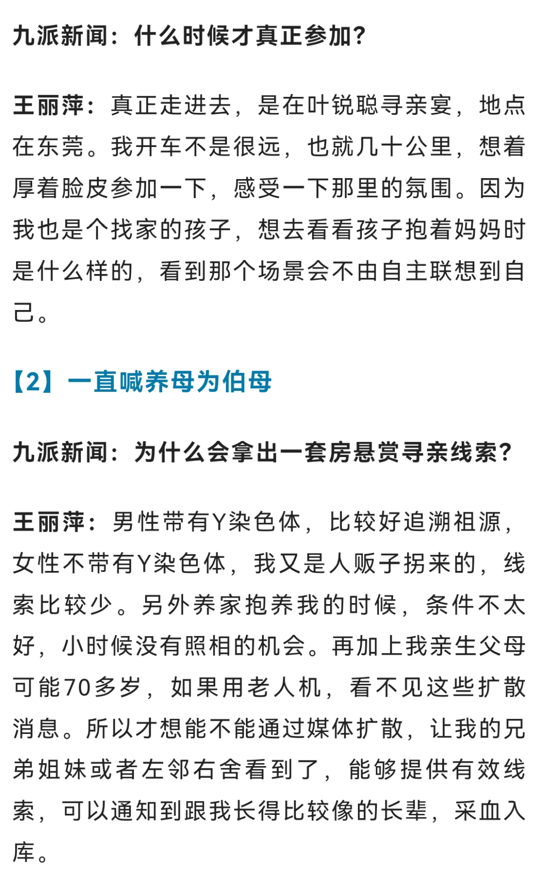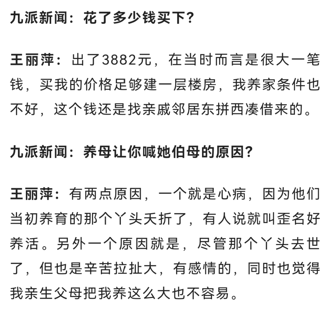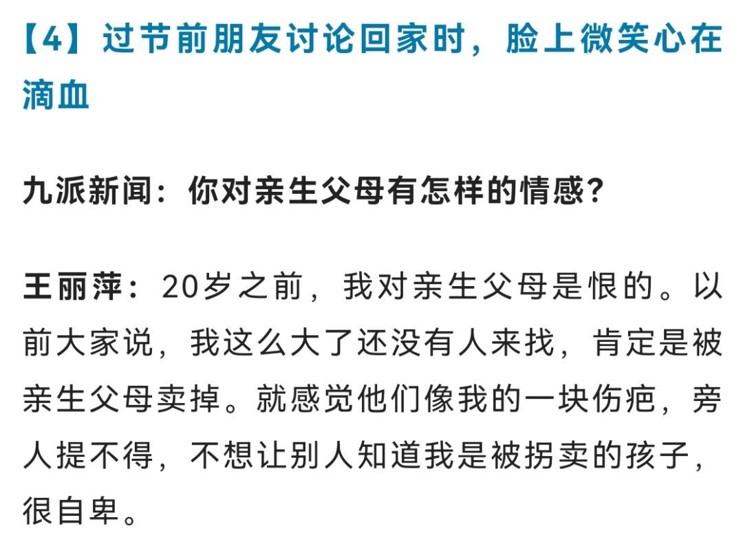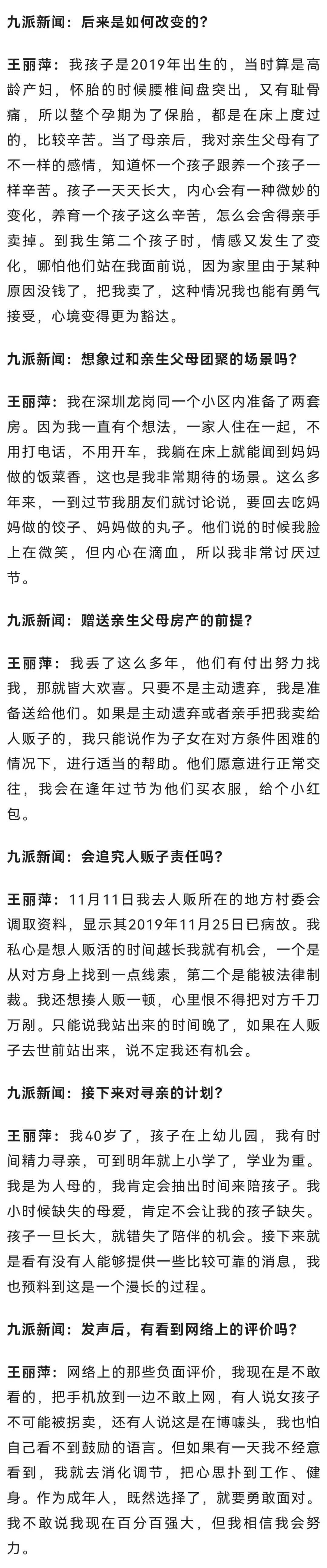 如今,王丽萍在深圳拥有多套房产,只要亲生父母并非主动遗弃自己,她准备将其中一套房产送给他们,同时她也期盼着“住在一起,闻着饭香就能团聚”的场景。有些网友认为她“炒作”,她坦言只想证明自己生活小康,不会成为亲生父母的负担。