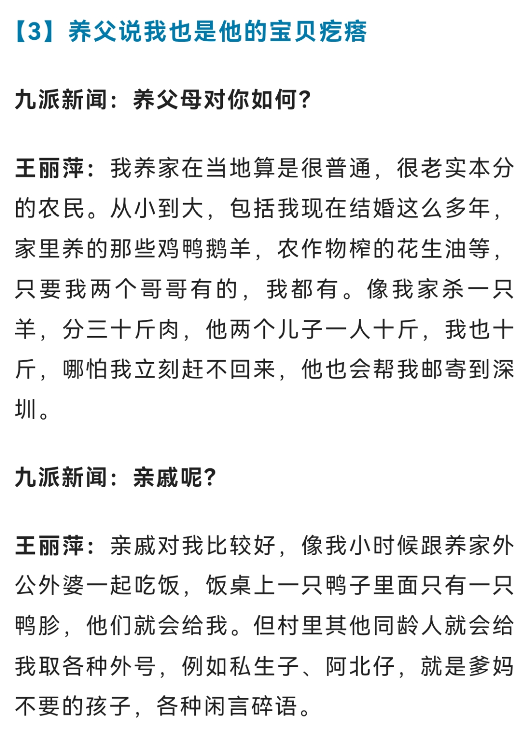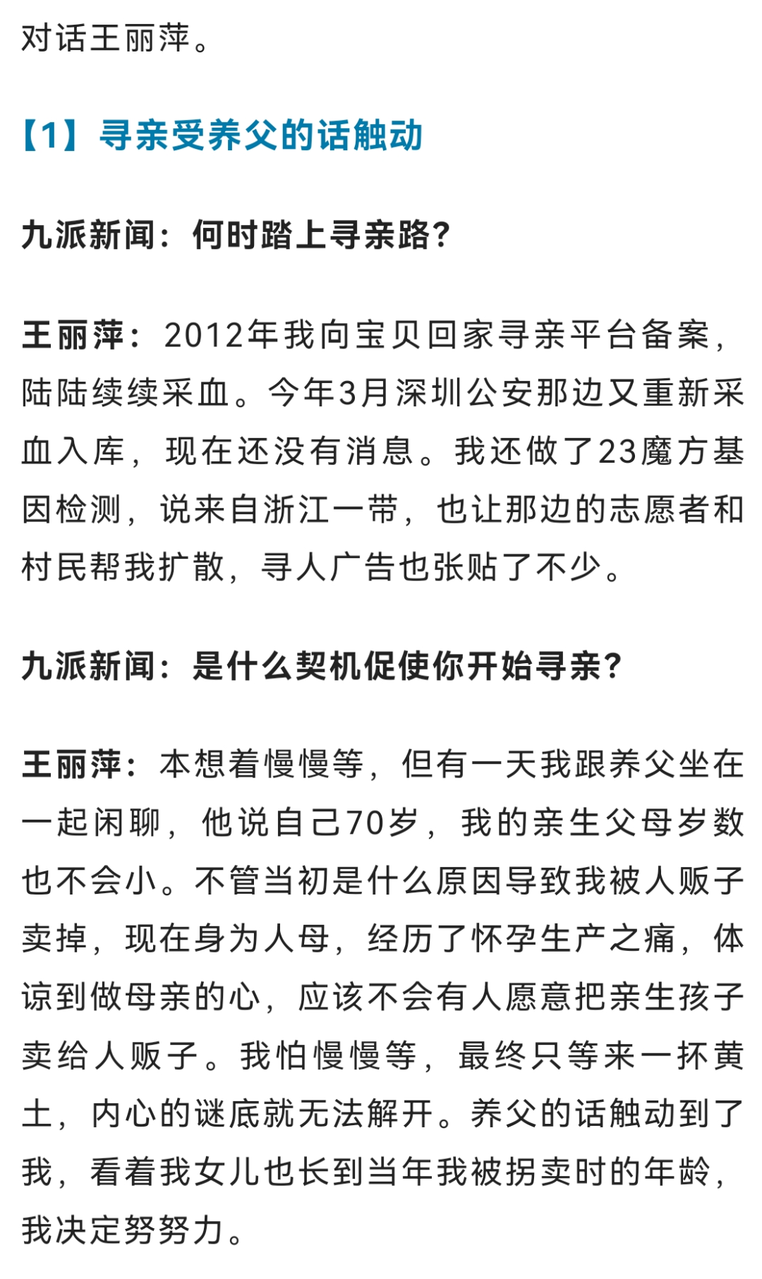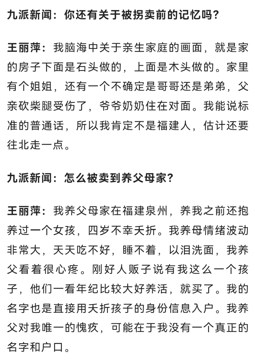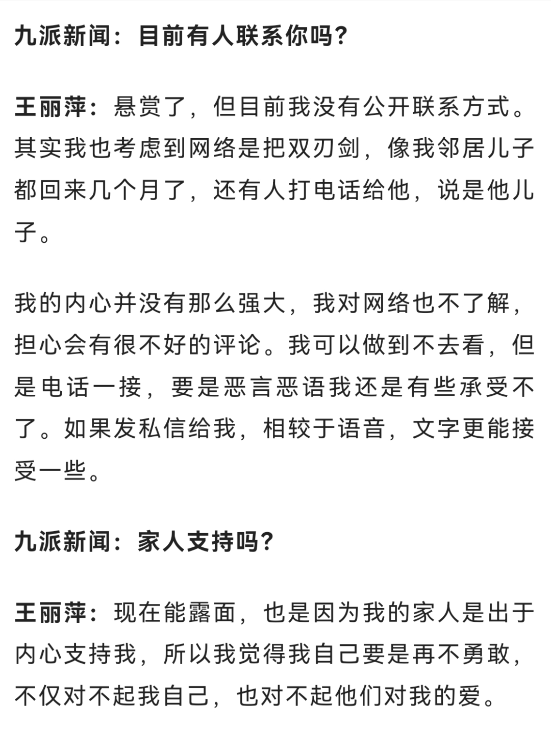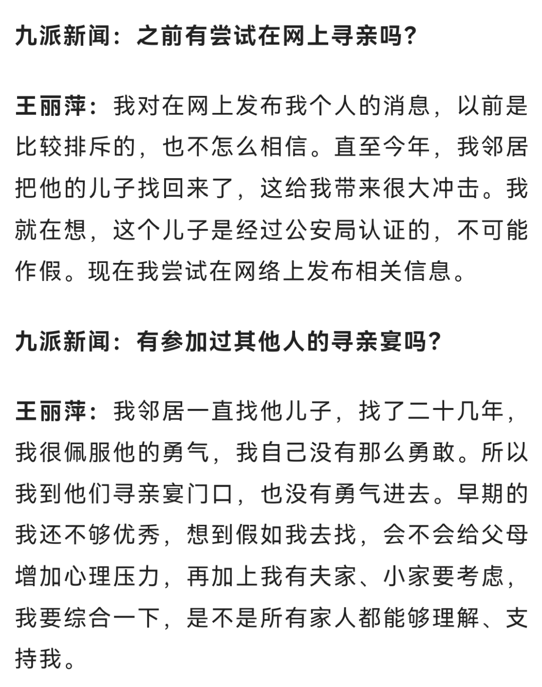 如今,王丽萍在深圳拥有多套房产,只要亲生父母并非主动遗弃自己,她准备将其中一套房产送给他们,同时她也期盼着“住在一起,闻着饭香就能团聚”的场景。有些网友认为她“炒作”,她坦言只想证明自己生活小康,不会成为亲生父母的负担。