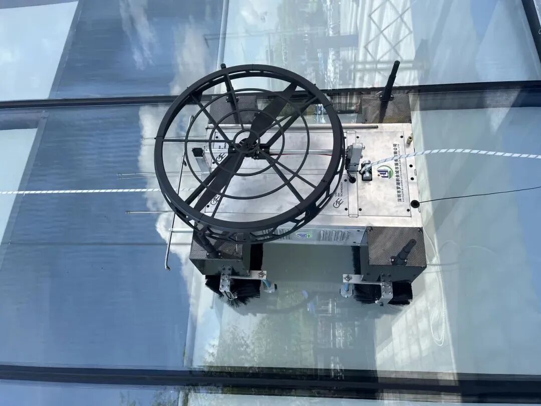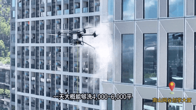 高楼幕墙上,机器人正忙着清洗