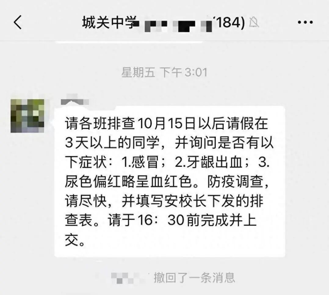 近期,多张网传聊天截图称,陕西商洛市洛南县城关中学,疑似发生学生“毒鼠强”食物中毒事件。聊天信息显示,10月15日城关中学正在进行校内健康排查,询问10月15日后,请假3天以上的学生是否出现感冒、关节酸痛等情况。