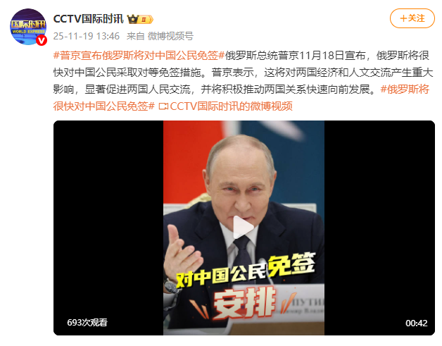 俄罗斯总统普京11月18日宣布,俄罗斯将很快对中国公民采取对等免签措施。普京表示,这将对两国经济和人文交流产生重大影响,显著促进两国人民交流,并将积极推动两国关系快速向前发展。
