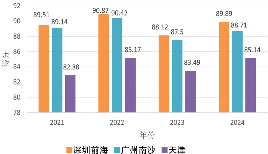根据中山大学自贸区综合研究院最新发布的“中国自由贸易试验区制度创新指数”(如图2所示)。2021—2024年间深圳前海连续四年位居全国自贸试验区综合排名榜首,是名副其实的制度开放先锋,为新质生产力发展奠定了坚实基础。广州南沙与天津在2022年到2024年间分别排名第三、第五。整体上看,三座城市的制度创新水平表现稳定,但在制度开放的创新方向与实施方面已出现结构性差异。