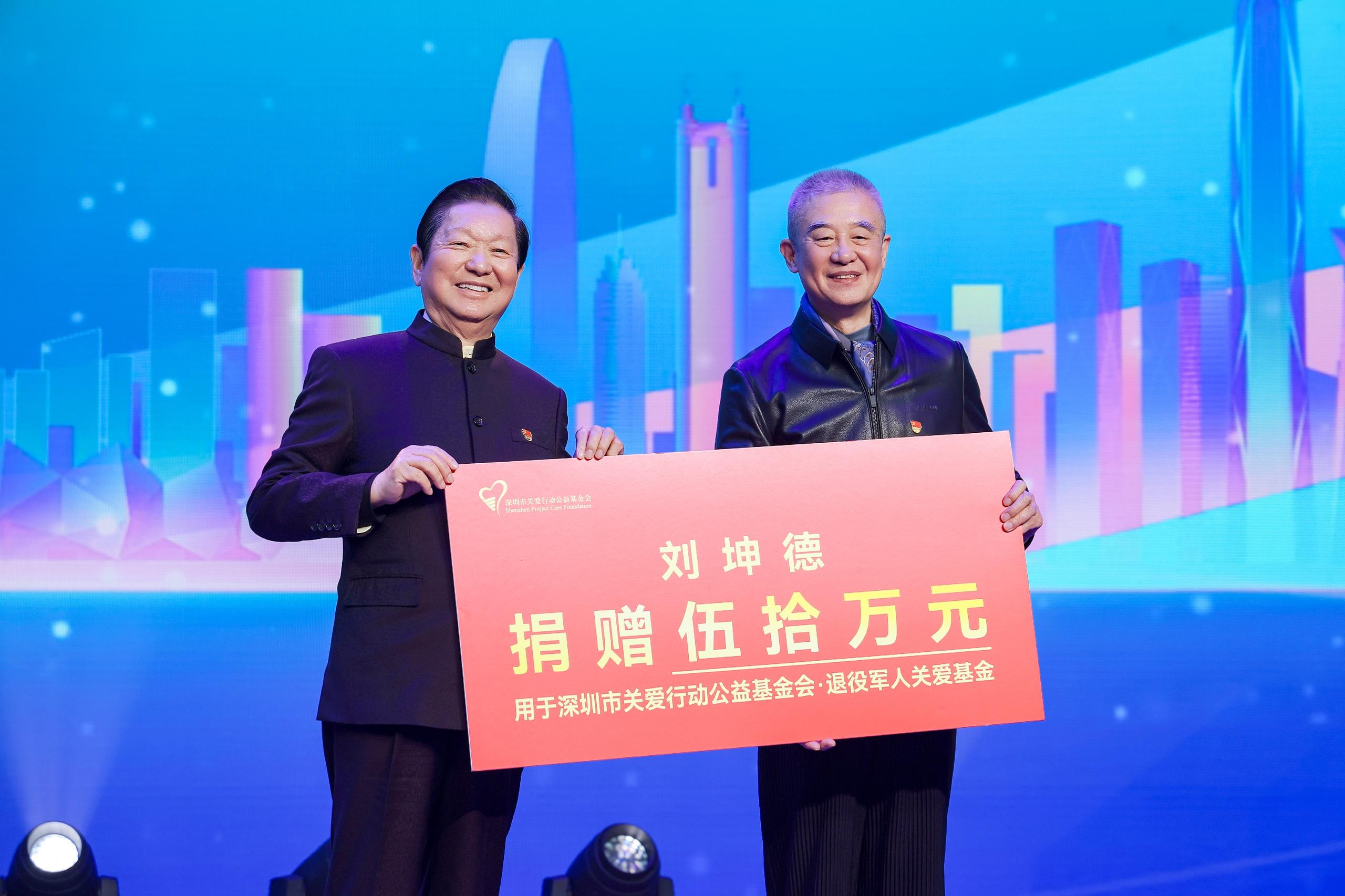 为扩大帮扶范围,活动现场发起公益捐赠。刘坤德带头捐赠善款 50 万元,爱心企业及人士纷纷响应:深圳爱尔眼科医院捐赠 25 万元,深圳美丽魔方集团捐赠价值 20 万元的爱心物资,易签链(深圳)科技有限公司、深圳市龙坚建筑工程有限公司各捐赠 10 万元,博瀚检测认证集团有限公司、深圳市葵花公寓各捐赠 5 万元,蒋洪库、石凤英夫妇捐赠 3 万元,张帮玉、詹永印、东方紫椹果酒各捐赠 2 万元,孙大海、段亚兵、陈玉堂、深圳市深水建设工程有限公司、深圳市天邻文化传播有限公司各捐赠 1 万元,现场捐赠总额达 139 万元。此外,现场大屏幕滚动展示爱心捐赠二维码,嘉宾们踊跃奉献爱心。张占恒代表关爱基金会接受捐赠,并为爱心代表颁发证书与牌匾。