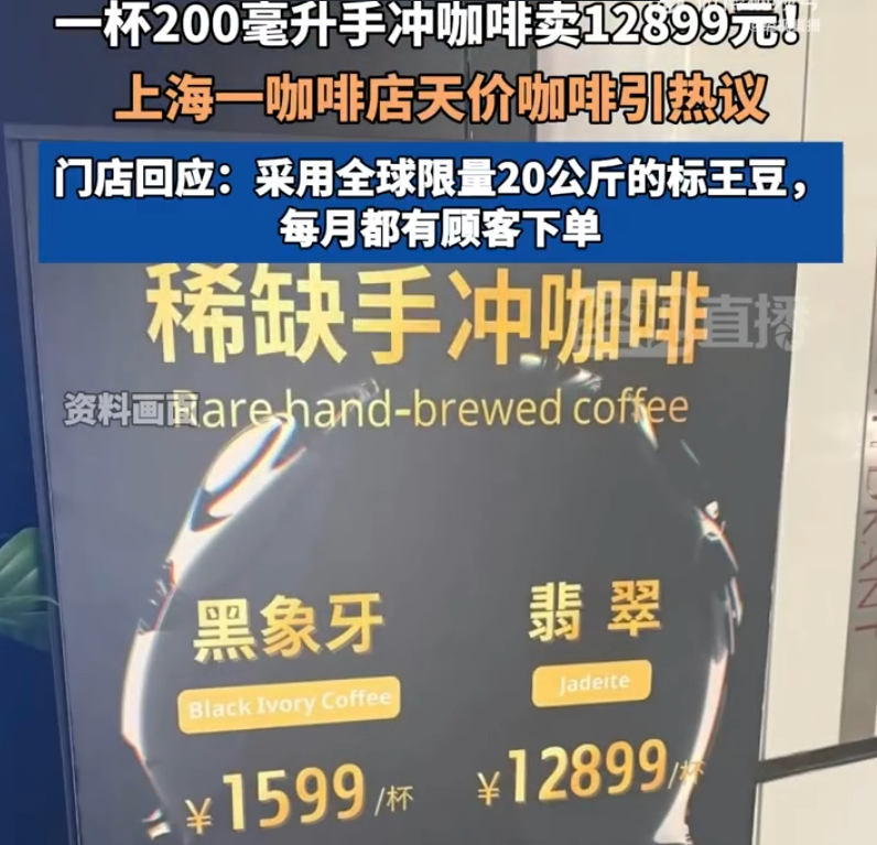 “一杯手冲咖啡12899元,每杯仅用13~15克豆子”,近日,有网友发帖爆料上海BFC外滩金融中心一家咖啡店推出“天价”咖啡,瞬间引发全网热议。有人调侃其“单价贵过黄金”,也有网友表示“明码标价,稀缺即合理”,不同观点碰撞之下,这款咖啡的定价和背后逻辑成为焦点。