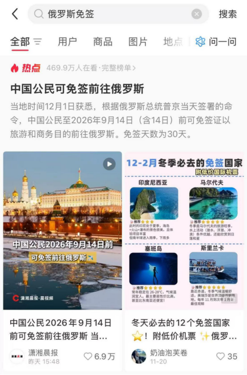 免签消息刚一发布,朋友圈、小红书等社交平台都开始发起了俄罗斯旅游的攻略,各大旅行社、线上平台、航司等机构也纷纷跟进推出旅游套餐及路线,一时间,去俄罗斯旅游仿佛成了社交平台上首要的谈资。