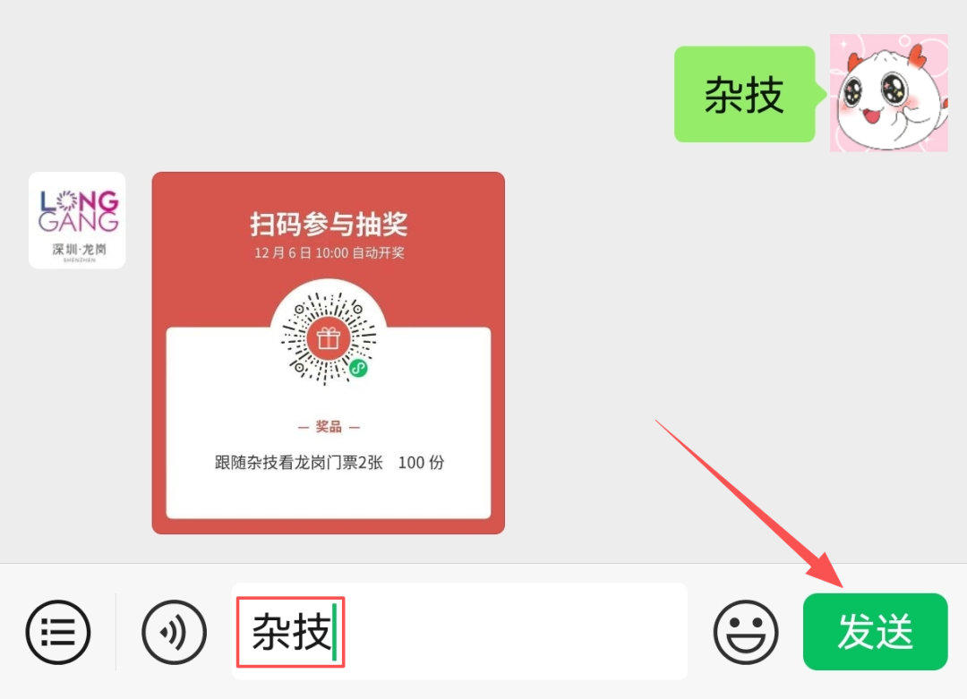 2.在“深圳龙岗发布”微信公众号对话框,回复关键词【杂技】,获取粉丝专属抽奖卡片,扫码参与抽奖(温馨提示:请不要点击抽奖小程序的其他广告)