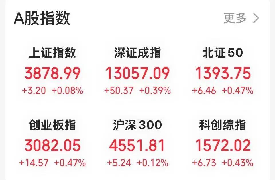 12月5日早盘,A股三大股指盘中窄幅震荡上扬,临近午盘发力拉升,沪指翻红。截至午间收盘,沪指微涨0.08%报3878.99点,深证成指涨0.39%,创业板指涨0.47%,沪深北三市合计成交9996亿元。