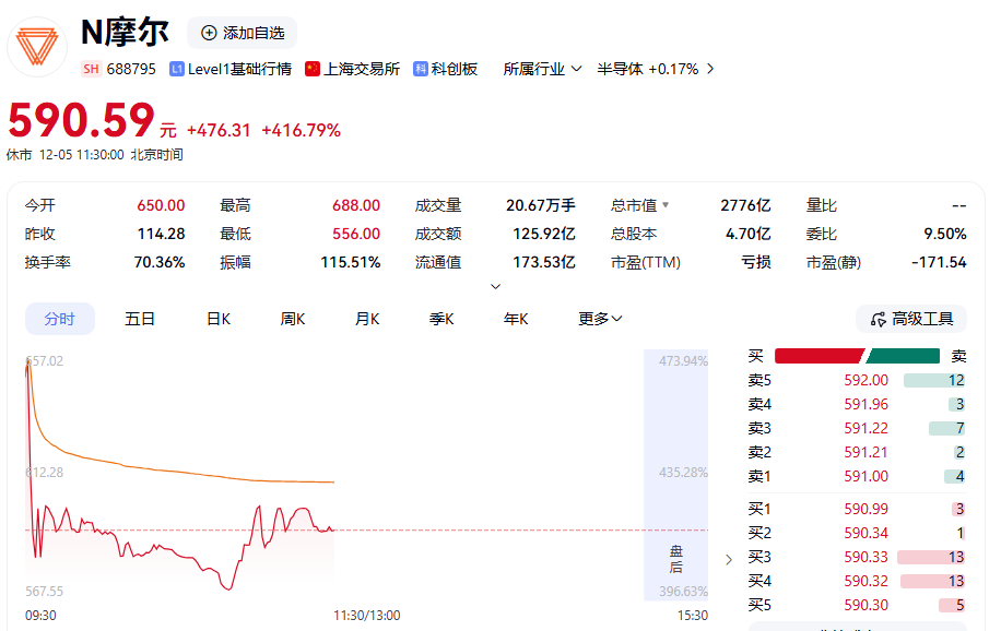 今日开盘后,摩尔线程股价开盘即大幅冲高,最高触及688.00元/股,对应涨幅超过500%;随后震荡回落,截至午盘报590.59元/股,涨幅416.79%;半日成交125.9亿元,居所有A股首位,最新总市值2776亿元。