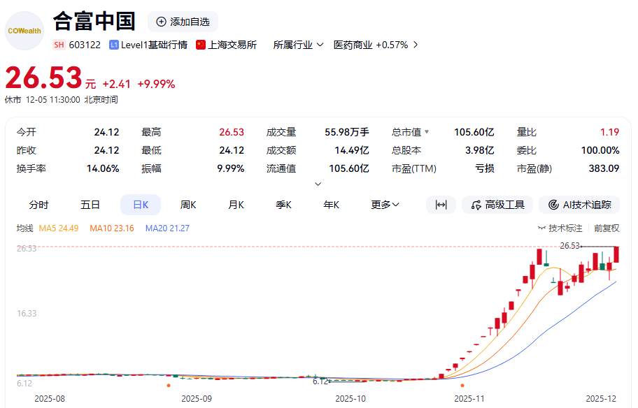 12月5日,合富中国再度涨停,在近26个交易日内斩获15个涨停板。截至午间收盘,该股报26.53元/股,总市值105.6亿元。