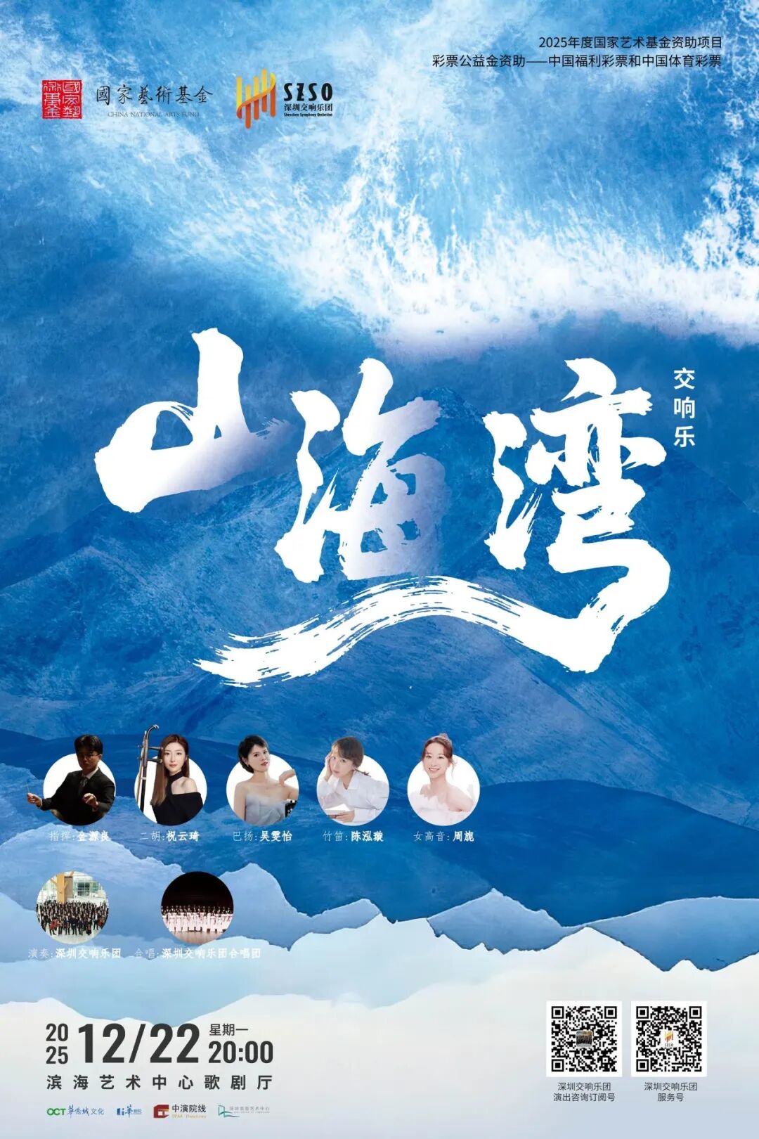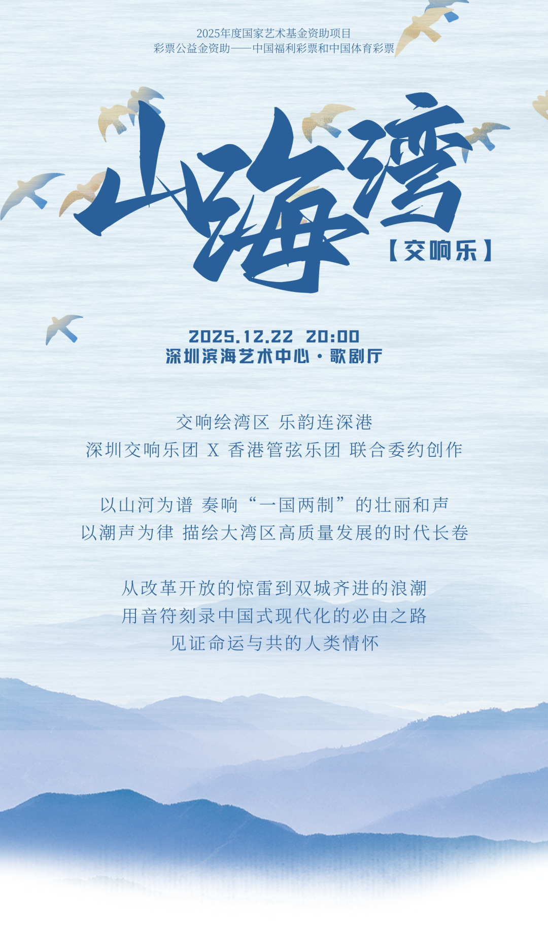 交响乐《山海湾》由深圳交响乐团与香港管弦乐团联合委约创作,表现深港两地情脉相通、山海相约,用音乐歌颂“一国两制”的伟大创举,描绘大湾区风起云涌的高质量发展图景,印证中国式现代化道路是中华民族复兴和建设人类命运共同体的必由之路。作品已于2024年6月入选文化和旅游部2024-2025年度“时代交响”创作扶持计划,并入选国家艺术基金2025年度大型舞台剧和作品创作资助项目。
