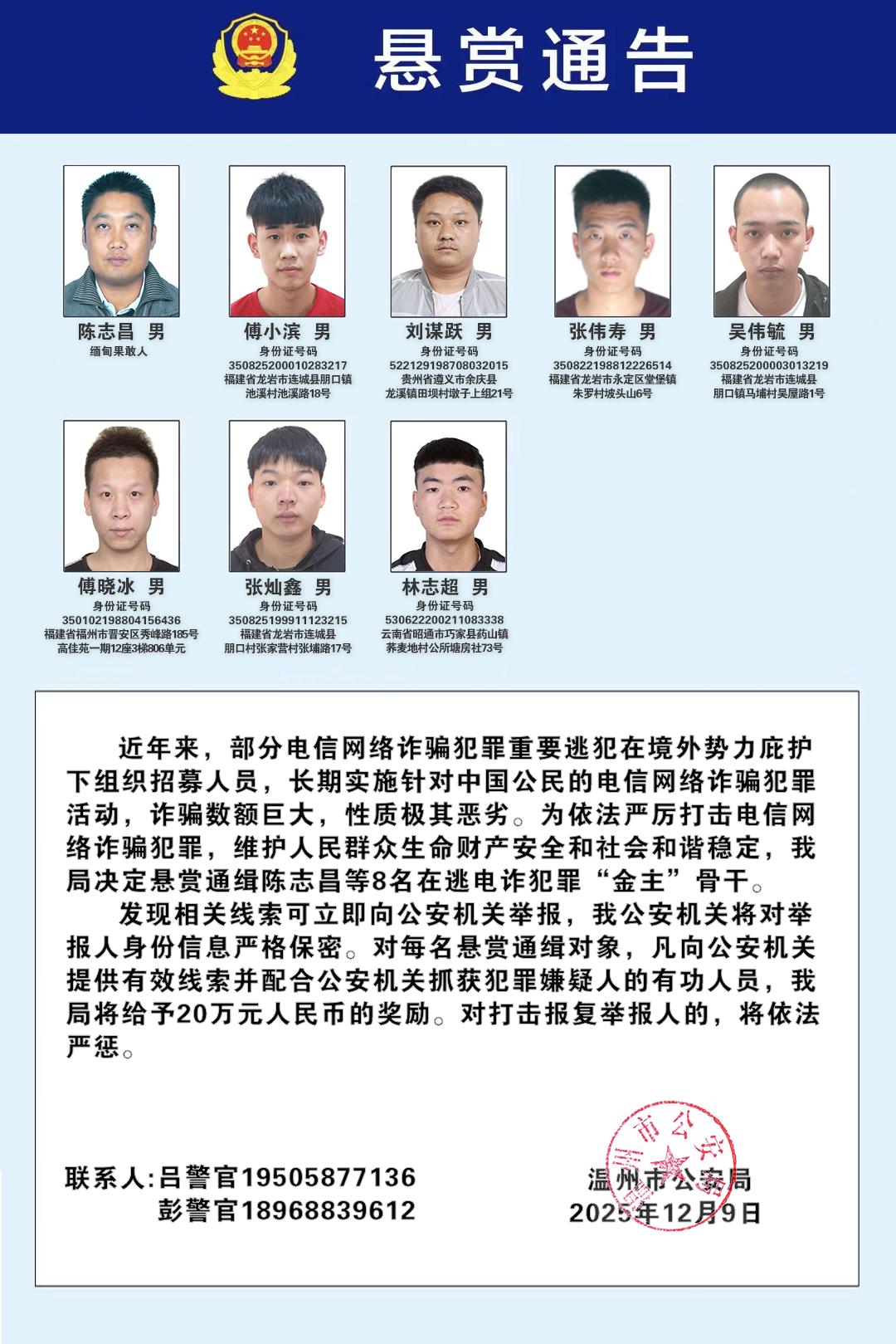 经查,近年来,吴启平、吴清正、傅小滨、欧长华等犯罪嫌疑人在境外势力庇护下,组织招募人员,长期实施针对中国公民的电信网络诈骗犯罪活动,诈骗数额巨大,性质极其恶劣。特别是公安部部署开展打击缅北涉我犯罪专项工作以来,在公安机关严打高压态势下,上述犯罪嫌疑人仍不收敛、不收手,继续大肆组织实施违法犯罪活动。该批在逃人员犯罪事实清楚、证据确凿充分,浙江杭州、温州,福建泉州、龙岩,河南平顶山,广东深圳,云南昆明和重庆等地公安机关决定对其进行公开悬赏通缉。