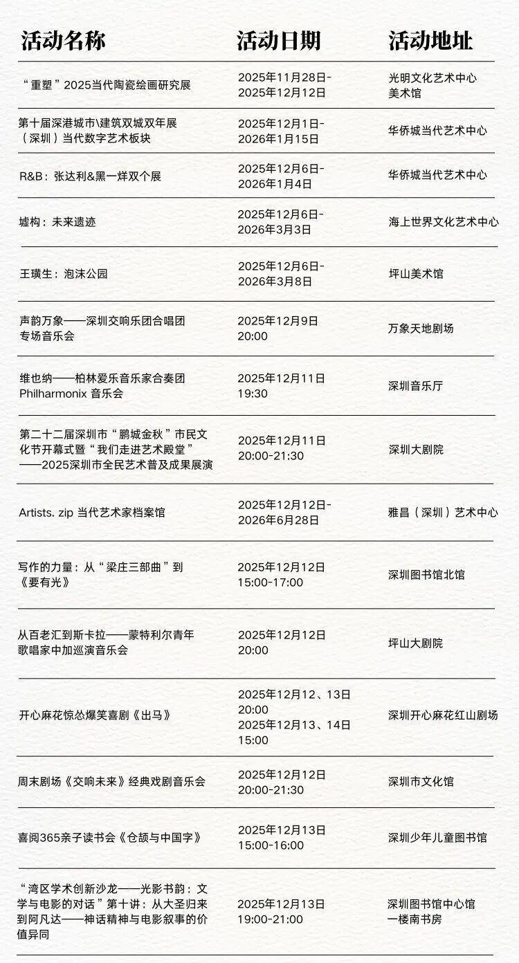 深圳一周文体旅活动指南(12月8日-12月14日)
