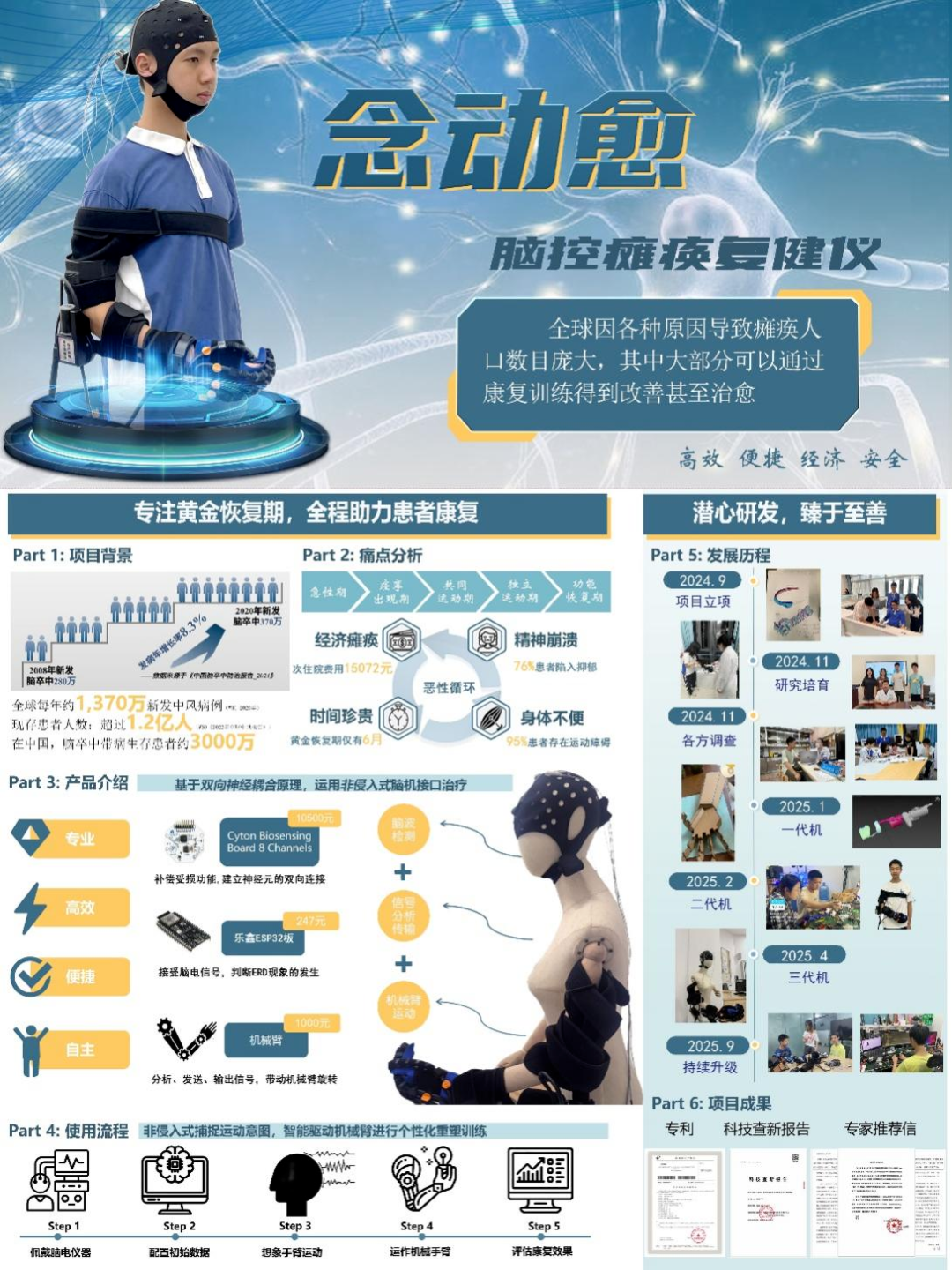 瘫痪患者数量不断增加,传统康复手段存在依赖被动训练模式,存在神经可塑性激活不足、人力成本高昂及康复效率低下等局限。该康复设备基于双向神经耦合原理,用非侵入式脑机接口技术,捕捉脑电信号识别运动意图,通过 “意图识别-动作执行-感官反馈” 闭环,驱动机械臂个性化训练。