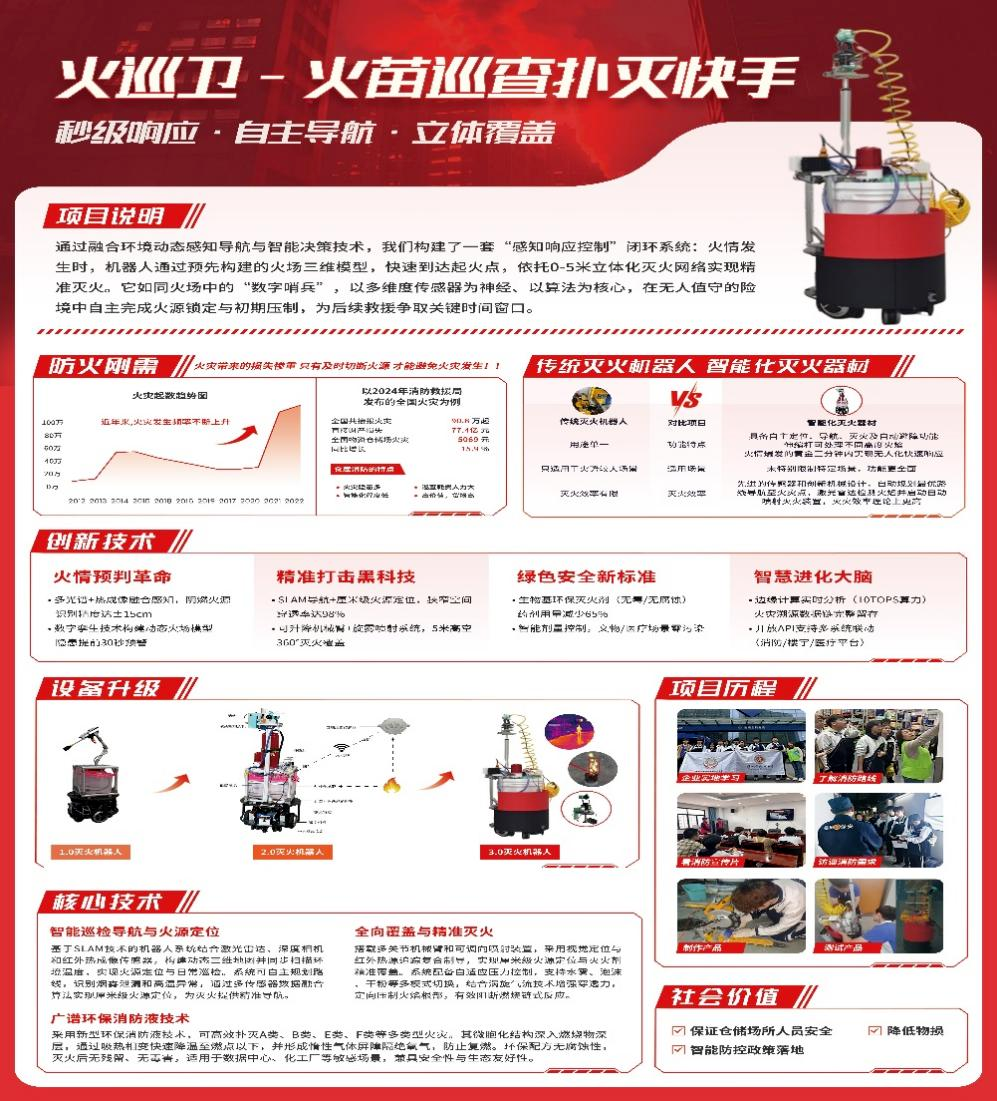 由于小型仓库等高危场景火灾隐患隐蔽,传统消防响应迟、有盲区。该项目用多光谱与红外热成像技术,精准识别早期火情,依托 SLAM 技术自主导航,可升降机械臂实现立体灭火,搭配环保灭火剂,无毒无残留。