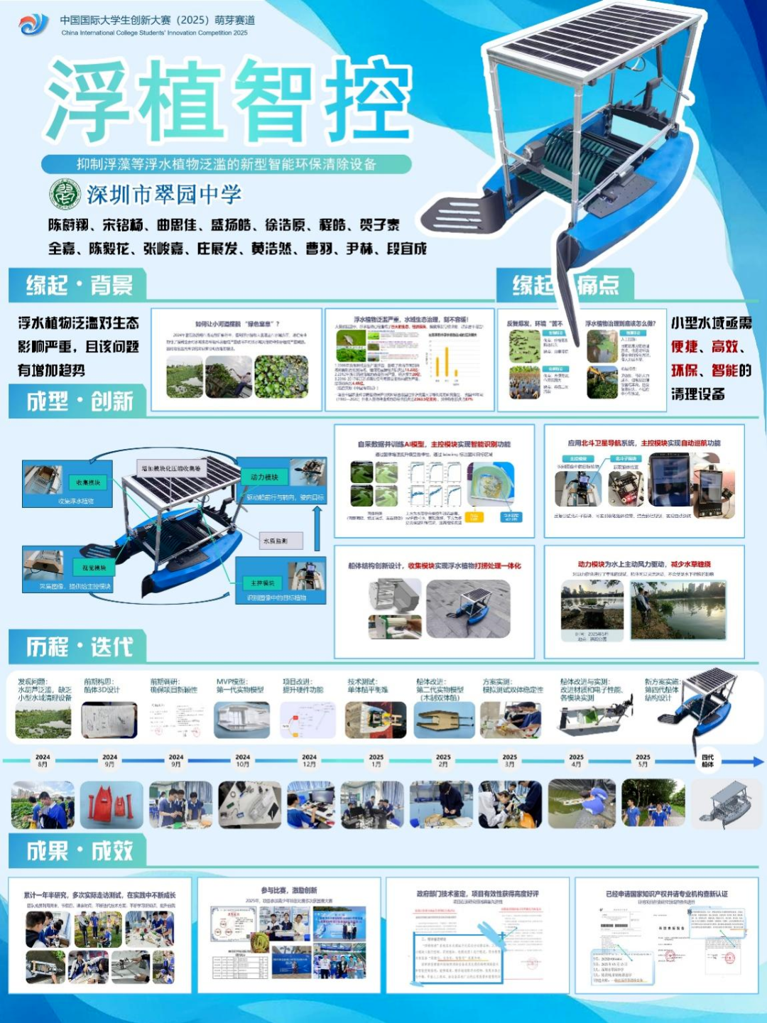 由于浮水植物泛滥破坏水域生态,尤其在中小型水域,传统清理设备价高、体大不适用。“能不能用科技让治理更聪明?”带着这样的思考,团队研发出集“监测-识别-干预-收集”于一体的浮植智控系统。“我们想证明,青少年也能为世界性生态难题提供中国方案。”项目负责人陈蔚翔说。