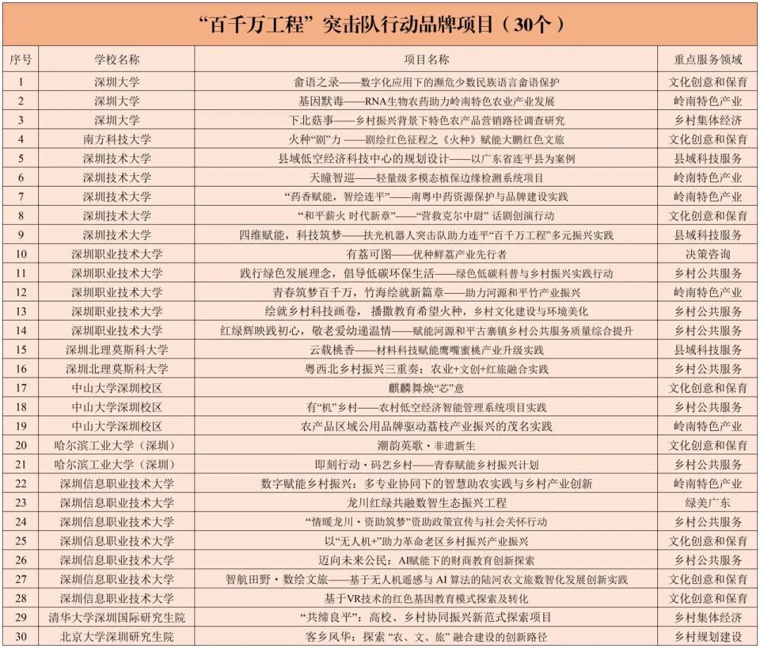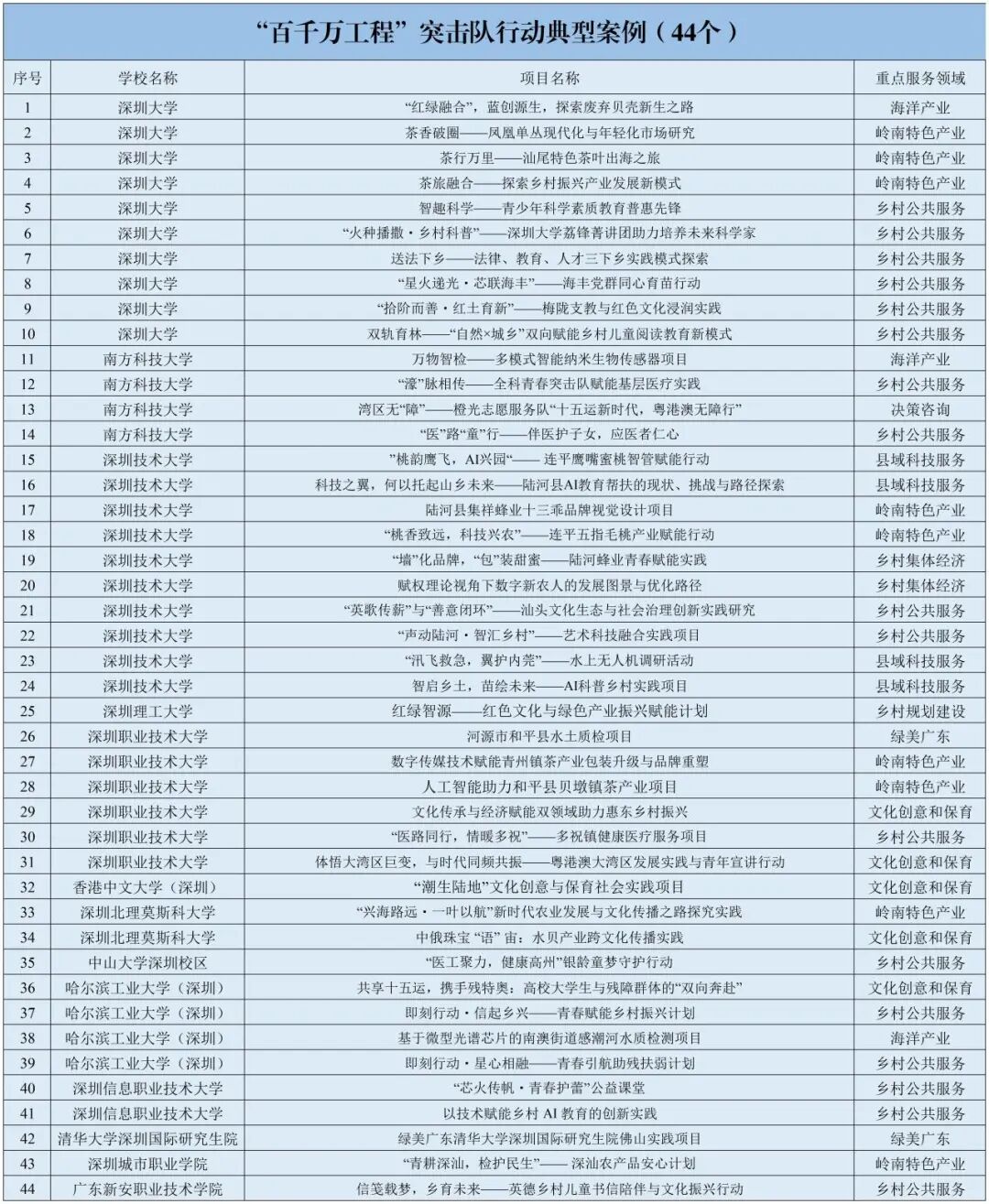 2025年,610余支深圳青年大学生“百千万工程”突击队与全省街道(镇)、社区(村)等单位成功结对并开展有效服务,为基层发展提供人才支撑与技术赋能。