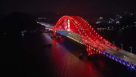 中国红象征“吉祥、进取”,契合南沙改革开放前沿阵地的特质,桥体吊杆面搭载LED灯带幕墙,将南沙水乡文化、海洋特色与粤港澳三地符号融入“光影画卷”,建成后迅速成为“网红打卡点”。