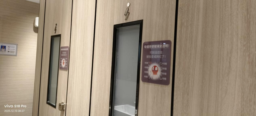 在商场负一楼的男厕所内,安装有特殊玻璃的厕所隔间旁张贴着一块醒目的警示牌,“吸烟将使玻璃变透明!可别没忍住被拍变成网红了”,金色字体旁还配有一个卡通化的“社死”表情包。