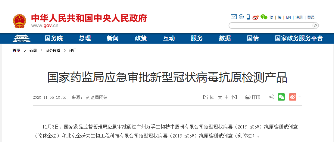 日前,万孚生物(股票代码:300482)新型冠状病毒(2019-nCoV)抗原检测试剂盒(胶体金法)获得国家药品监督管理局应急审批通过(国械注准20203400830)。