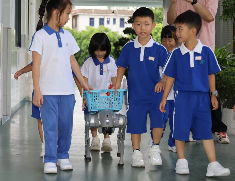 大望学校宇树机器狗“望望”与学校龙狮社团共舞喜迎新生,校家社三方联动,手写祝福“齐植共育树”。该校校长刘建琪偕共建单位代表与行政团队为新生送上“秋天第一颗糖”,祝愿孩子们在人生新阶段甜甜蜜蜜、幸福成长。该校信息社团的学长学姐们别出心裁,操作机器狗充当开学“领书小助手”驮着装满新书的箩筐,稳健走向小朋友,又萌又可靠。学生们惊喜不已,纷纷上前互动。