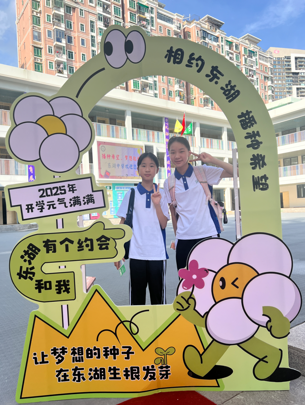 东湖中学太安校区校门口立着两座“相约东湖 播种希望”主题打卡框,蓝绿主色调衬着校名,成了学生们定格新学期笑脸的热门地,校领导与行政干部身着整齐校服,手持印着东湖logo和校训的“希望种子卡片”,笑着递到每一位入校学生手中,一句句“新学期加油”,让开学的仪式感满溢校园。