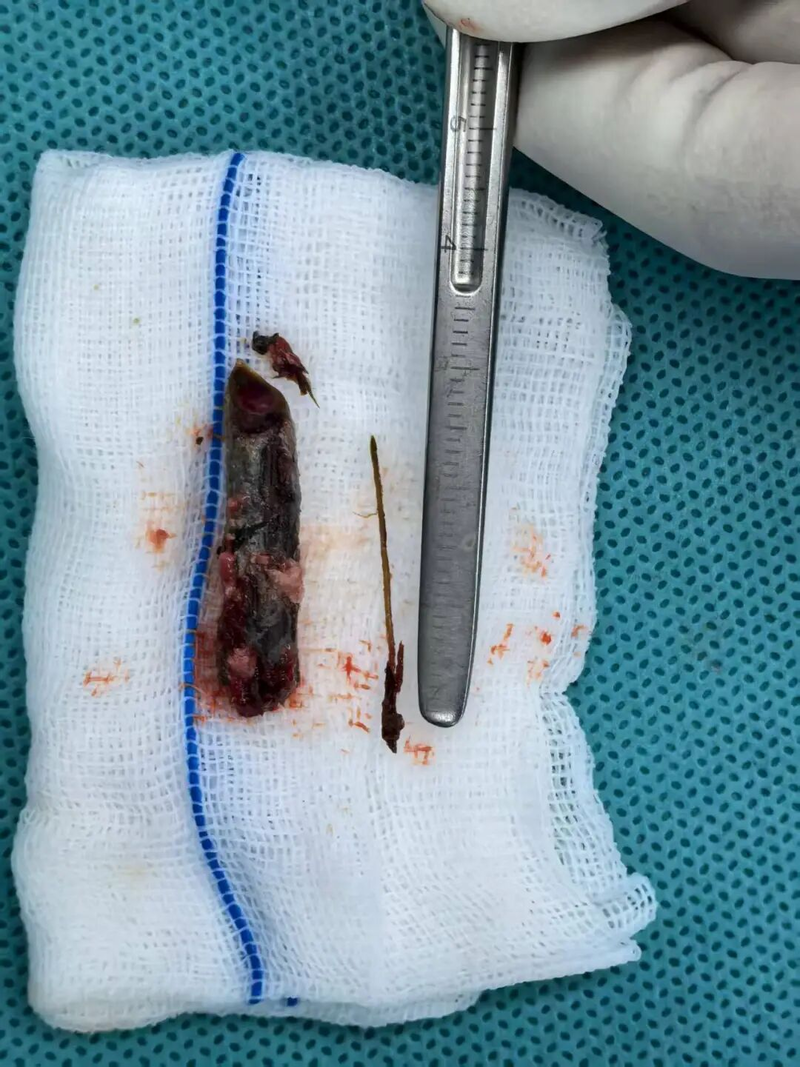 鼻内镜微创手术由主任张庆丰、主任医师李丽明指导,唐志元完成。当唐志元打开阿杰右侧后组筛窦,小心翼翼地探查后,这个令人震惊的“异物”呈现在大家面前:取出的并非预想的骨瘤,而是一截长约3厘米、质地坚硬的树枝!