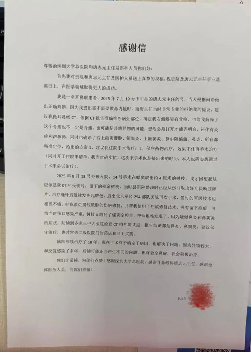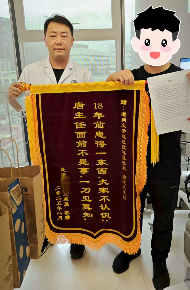 “感谢唐医生的专业判断和精湛技术,没有整个团队细致的手术,我这根‘心头刺’还不知道要扎多久。感谢所有医护人员的精心照料。”阿杰及家属对深圳大学总医院耳鼻咽喉头颈外科医护团队表达了最诚挚的感谢,并送上了锦旗和感谢信。