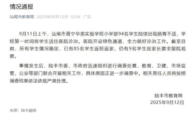 9月12日,汕尾陆丰市教育局发布情况通报称,9月11日上午,汕尾市普宁华美实验学校小学部94名学生陆续出现肠胃不适,学校第一时间将学生送往医院诊治。医院开设绿色通道,全力做好诊治工作。