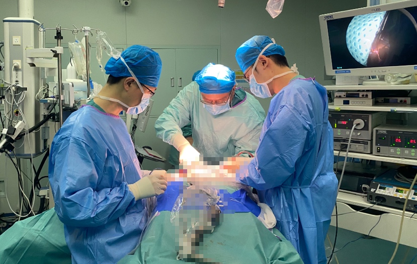 胸外科团队沿右侧第5肋间开了一个七八公分的小口,胸腔镜探入后,快速吸净胸腔积血,刘继先主任精准找到出血点,“左下肺血管畸形得厉害,还有几个溃疡灶在渗血,必须尽快切除病变肺叶。”