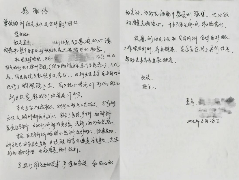 回顾这场生死经历,林棱最感激的是北大深圳医院的多学科团队。在出院前,她趴在病床上,一笔一划写了封感谢信,“本次手术难度极大,我们心理压力也很大… …是您们用专业的技术、严谨的态度和贴心的关怀,让我在病痛中感受到温暖,也让我对康复充满信心。”