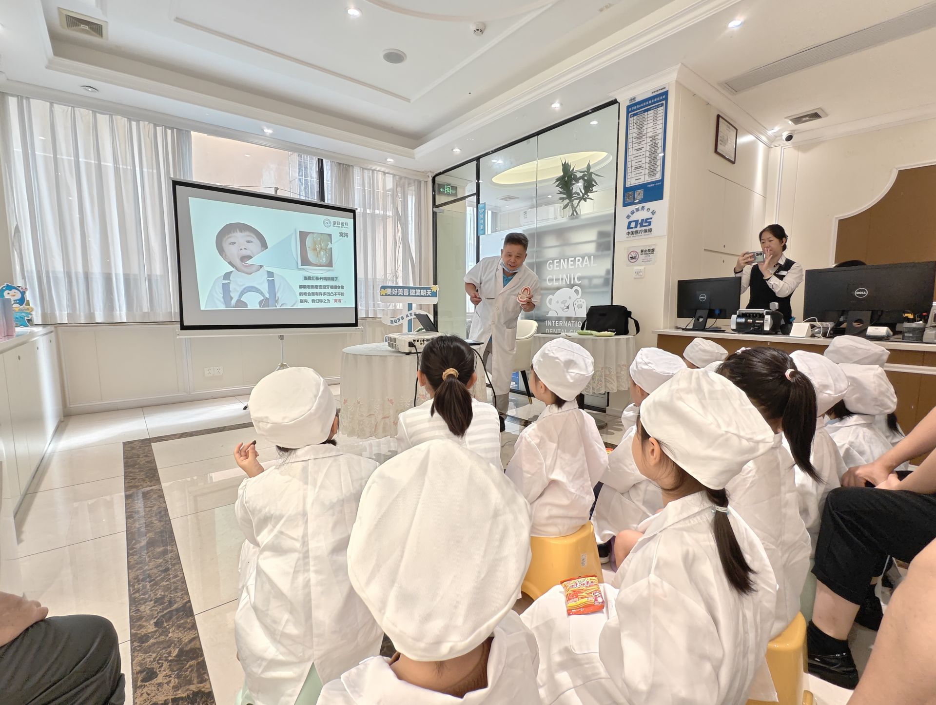 随后,社工带着孩子们来到索菲齿科,换上迷你白大褂,化身“小牙医”。牙科医生播放动画短片《牙齿王国的保卫战》,让孩子们形象了解龋齿形成过程的趣味故事,并通过3D牙齿模型演示“巴氏刷牙法”。孩子们手持模型牙刷,跟着医生口令反复练习。在医生全程监护和指导下,“小牙医”们手持专业口镜,模拟体验为爸爸妈妈检查牙齿,认真填写“诊断报告”。