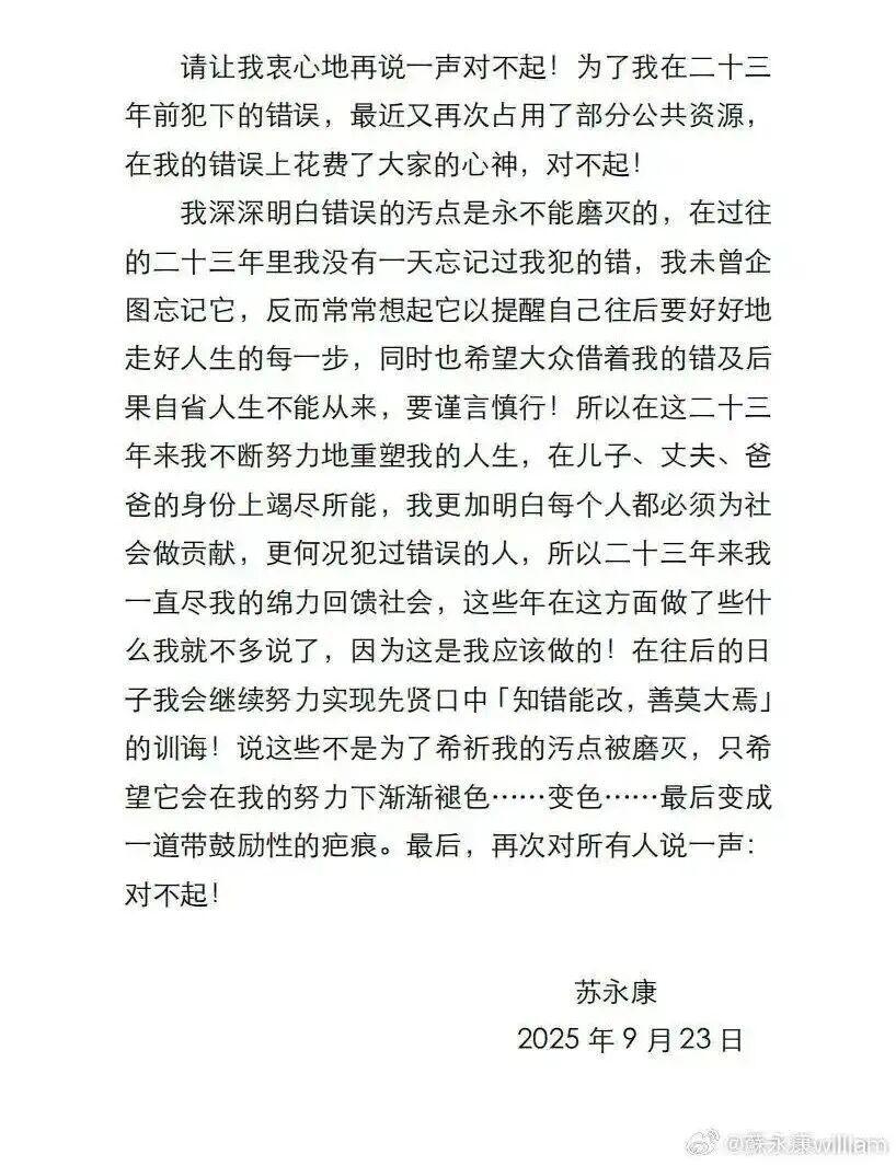 “请让我衷心地再说一声对不起!为了我在二十三年前犯下的错误,最近又再次占用了部分公共资源,在我的错误上花费了大家的心神,对不起!