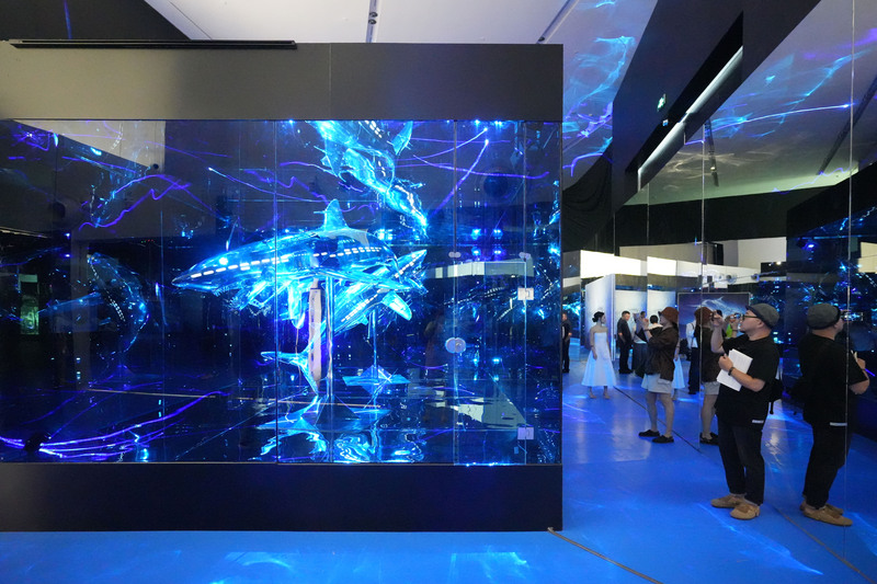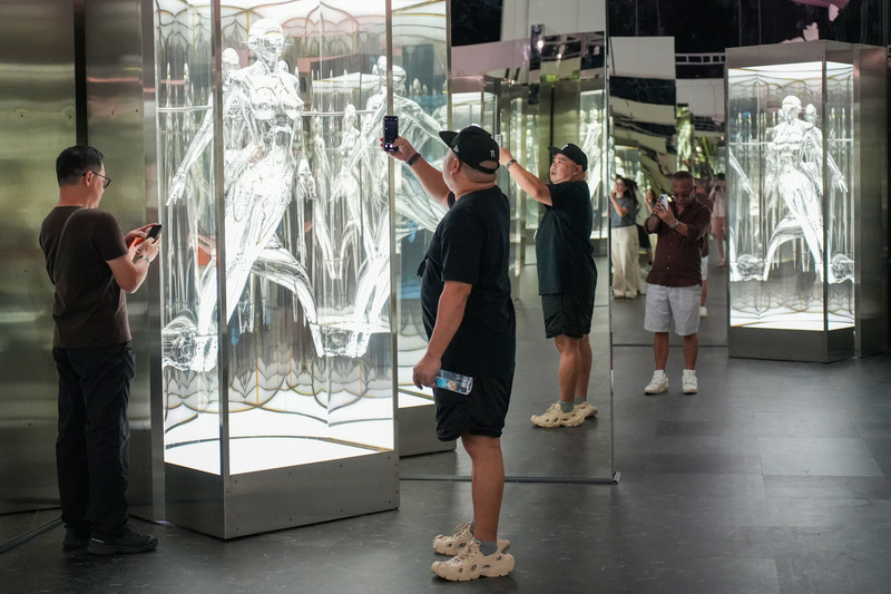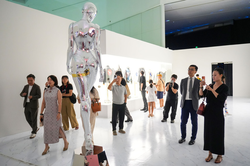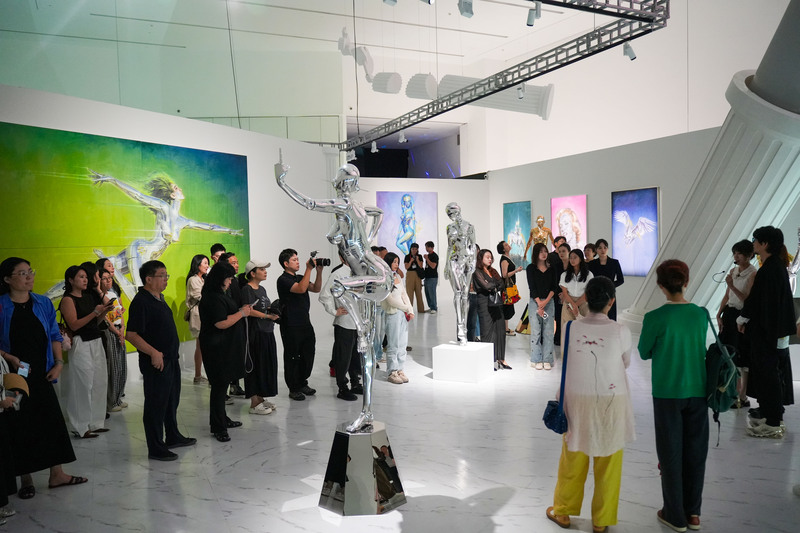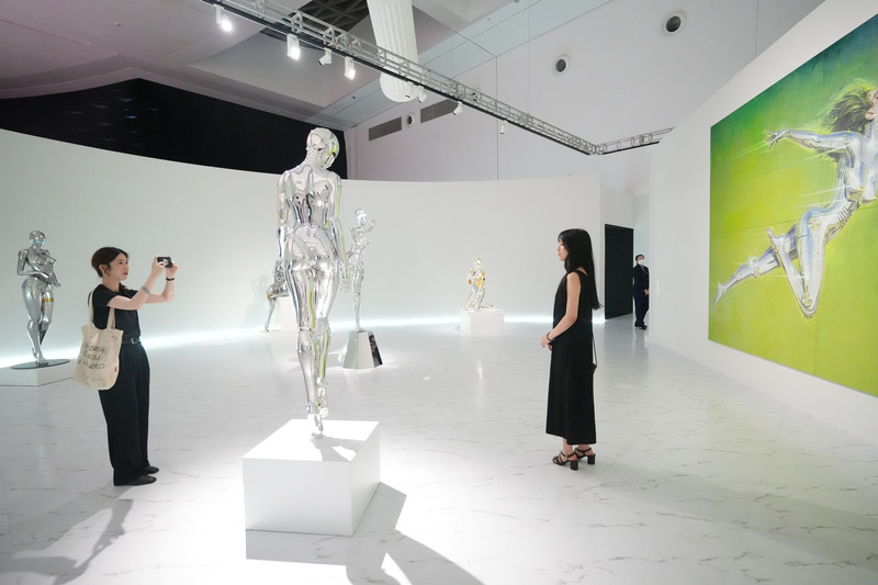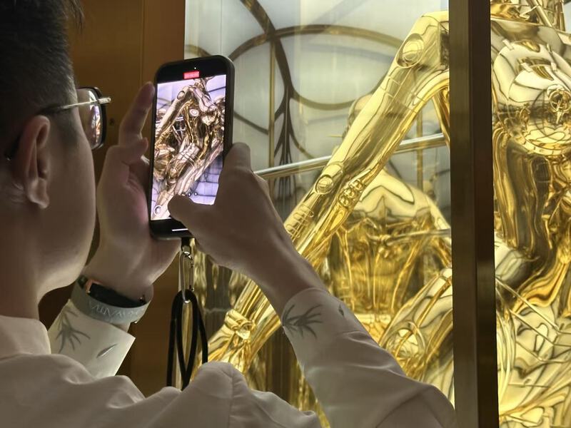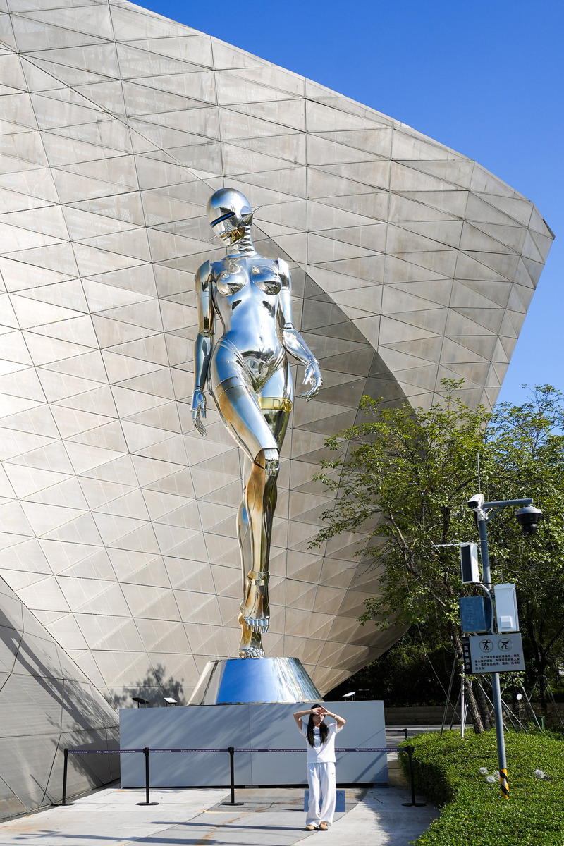 展览开幕前,曾于2018年Dior秀场和上海展出、引发轰动的高达12米、重达数吨的巨型机械姬雕塑率先在“两馆”西南花园广场落地。这件作品以耀眼金属质感与强烈光影反射构筑出未来感十足的视觉奇观,成为深圳秋冬公共艺术空间中的焦点景观。黄金周期间,“两馆”还在深业上城率先展出约4米高的大型雕塑《太空旅行者》,作品以未来虚拟叙事探讨“智能、身体与时间”的关系,激发观众对科技与人性的思考。