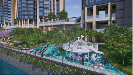 深铁相关负责人表示,该项目通过重塑场地关系,实现亲水目的,打造滨水活力商业+绿色岸线景观带。项目巧妙地融合“叙事性”与“功能性”。整个亲水景观空间规划了多达12个园林节点,设有滨水观景区、观瀑休闲区、星际乐园主题游乐场,为不同年龄段居民打造充满诗意的亲水休闲空间。