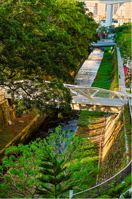 深铁珑境项目北侧明渠景观提升工程位于深圳市龙华区的核心区域,高峰河属于观澜河水系三级支流,上游为阳台山高峰水库,下游汇入龙华河。全长约2.05公里,宽约10米,将原本传统的水渠空间转化为周边居民亲水休闲和生态体验绿色岸线景观带。