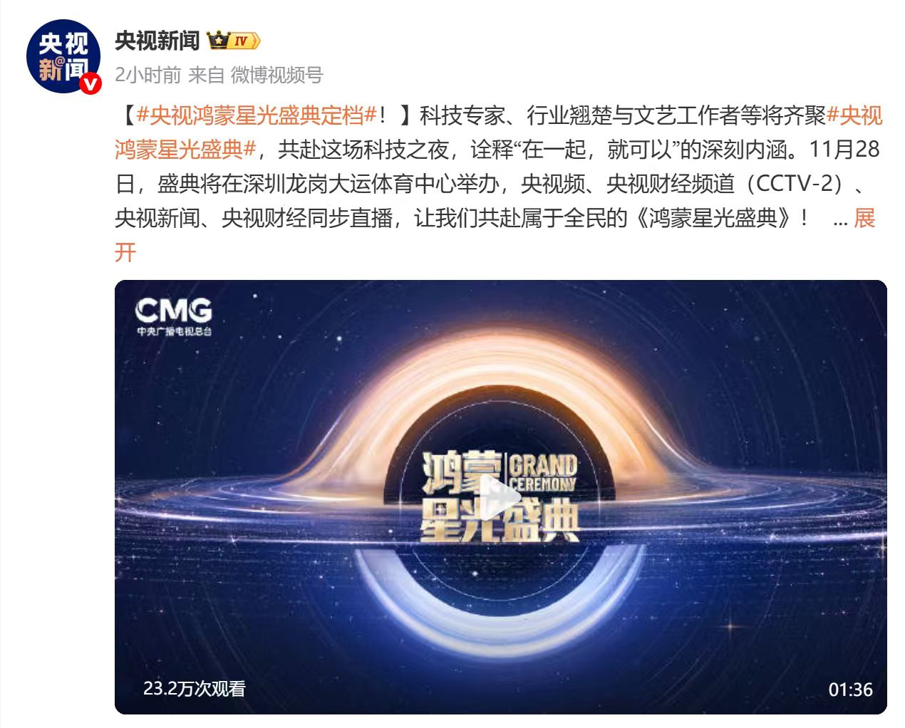 10月17日,央视官宣,数字中国十周年央视限定晚会《鸿蒙星光盛典》将于11月28日在深圳龙岗大运体育中心举行。时值“十四五”收官与“数字中国”十周年的关键节点,本次盛典以“在一起”为主题,旨在打造一场全民见证、行业共享的科技晚会,集中展示以鸿蒙为代表的中国科技创新成果。作为全栈自研的基础软件系统,鸿蒙的成长印证了中国在核心数字技术领域的突破与实力。此次晚会既是对过往突破的回顾,也是对未来科技生态共进的展望。