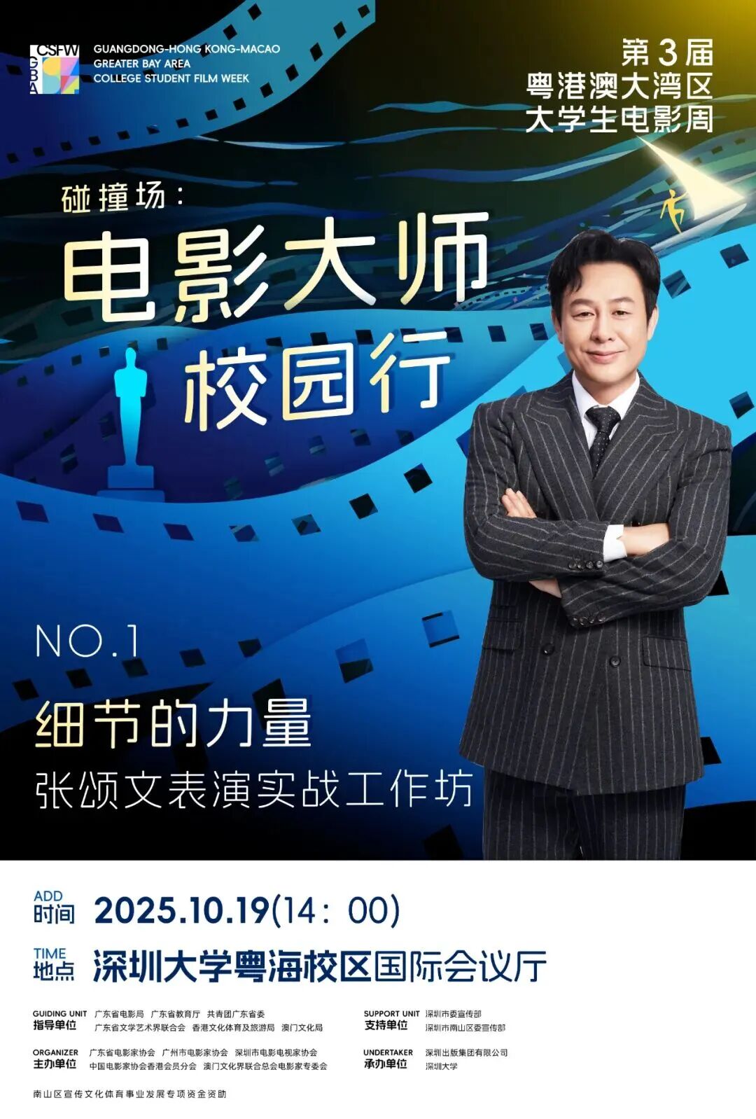 第三届粤港澳大湾区大学生电影周以“少年驭光,帧见未来”为主题,将于10月19日在深圳大学(粤海校区)正式启动。其中,“碰撞场:电影大师校园行”活动将邀请梁晓声、张颂文、李亚威等行业名家走进校园开展现场教学,助力青年提升电影专业素养。👉新闻详情