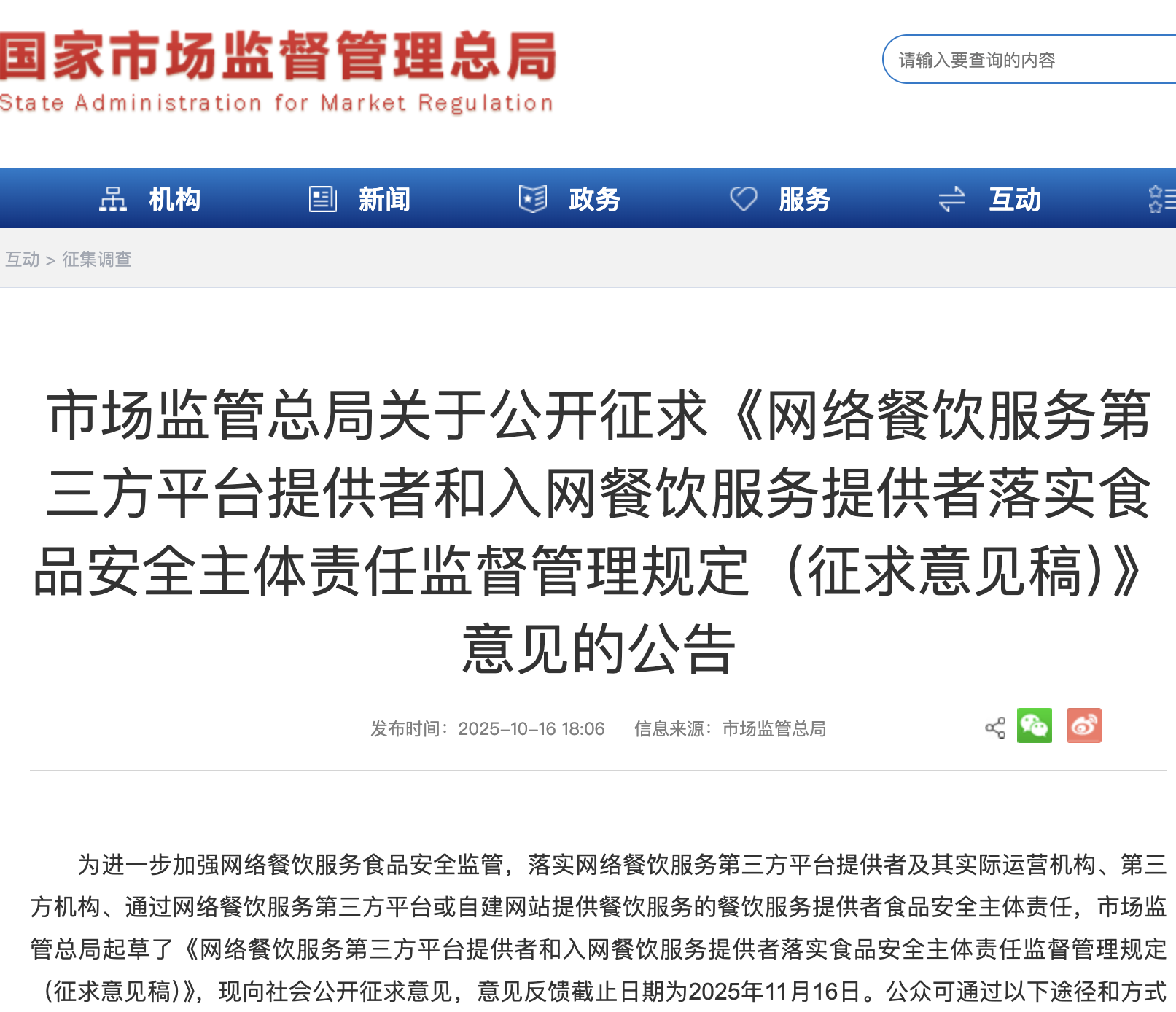 近日,市场监管总局公布《网络餐饮服务第三方平台提供者和入网餐饮服务提供者落实食品安全主体责任监督管理规定(征求意见稿)》,向社会公开征求意见,反馈截止日期至2025年11月16日。从“虚假堂食”到“AI门头”,此类外卖行业乱象屡见不鲜。记者查阅发现,新规针对网络餐饮服务长期存在的食品安全隐患,对平台责任不清、入网商家管理不严等环节作出系统性规定。👉新闻详情