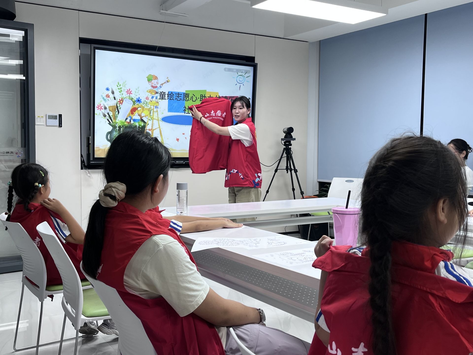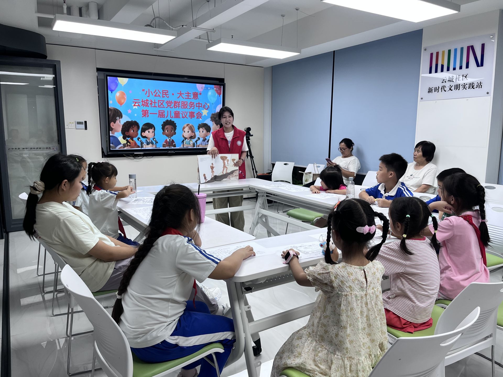 活动开始,云城社区党群服务中心社工拿起手中的“红马甲”,询问参与者是否在生活中有留意到,随后揭秘“红马甲”身份——志愿者并一一解答关于志愿服务的内容。“小公民・大主意”云城社区儿童议事会环节拉开帷幕,以 “你最喜欢的绘本故事” 为话题,鼓励孩子们主动发言、分享想法。孩子们纷纷举起小手,大胆表达自己喜爱的绘本,社工认真倾听,引导内向的孩子参与讨论。这场轻松愉快的议事会中不仅让孩子们感受到被倾听被尊重,并且交流中激发彼此的阅读兴趣。